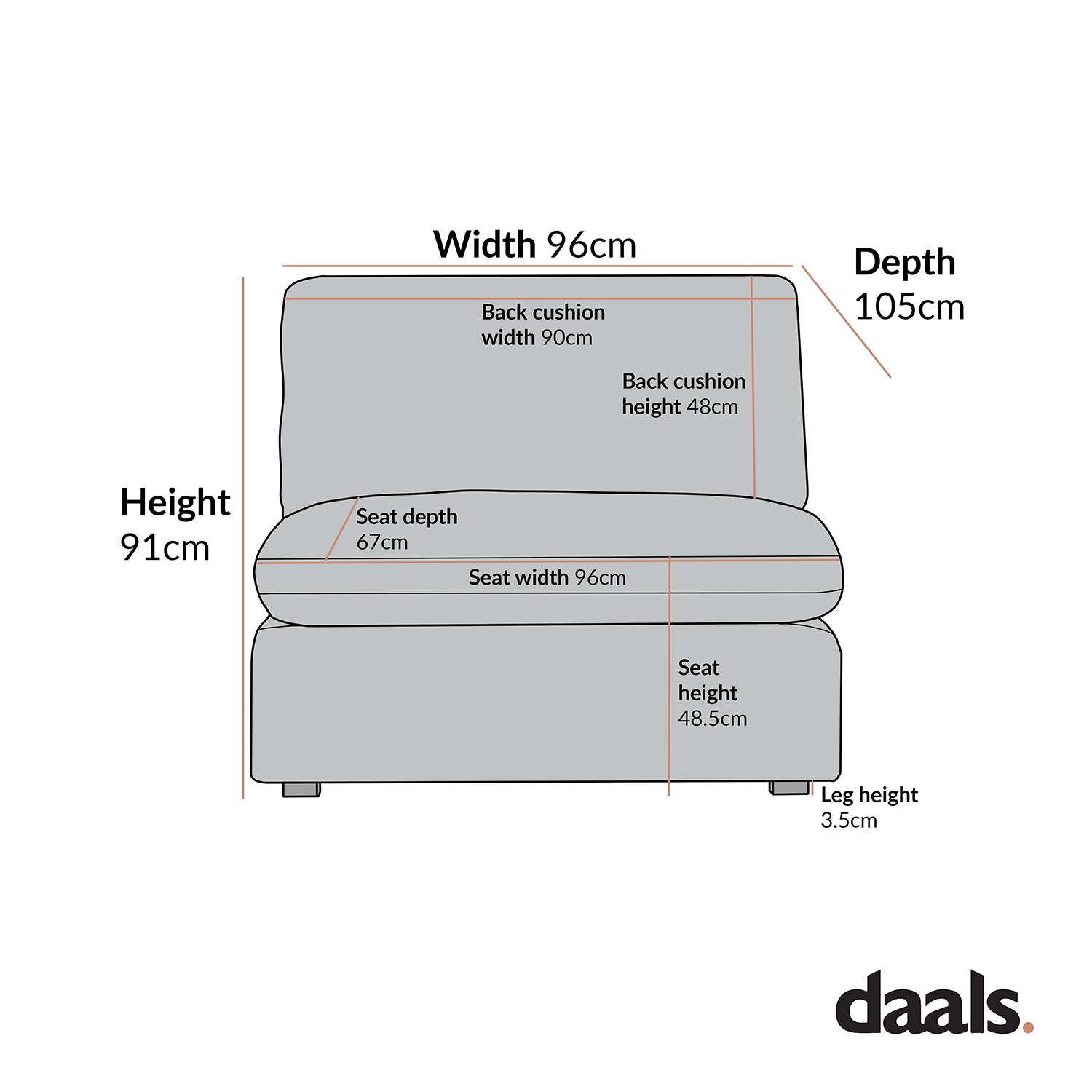 - Dimensions du module canapé 1 place : L 96 x P 105 x H 91 cm.