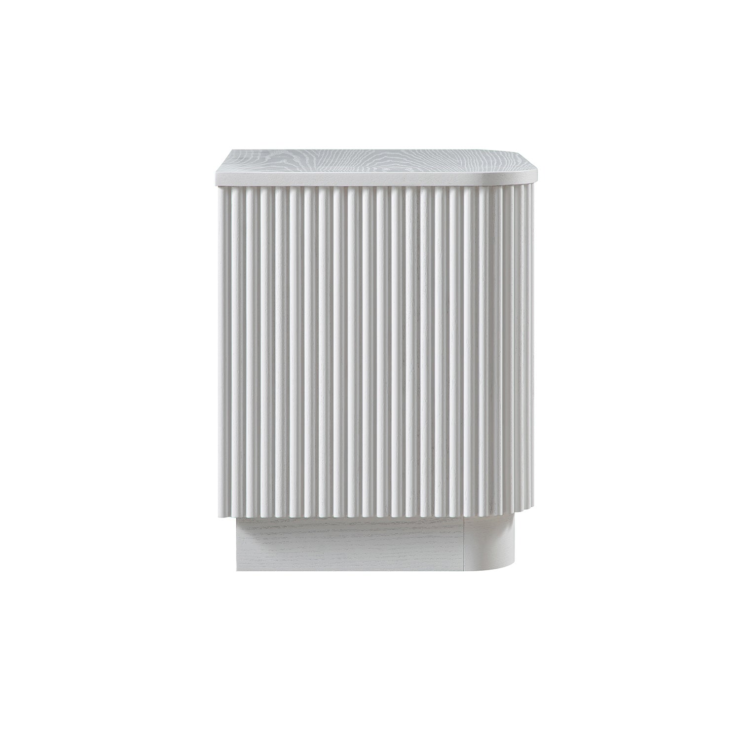 - Avec sa silhouette doucement arrondie, ses détails cannelés verticaux et sa conception d'étagère ouverte, la table de chevet à 1 tiroir Maru en blanc délavé apporte une présence calme et sculpturale à votre chambre.