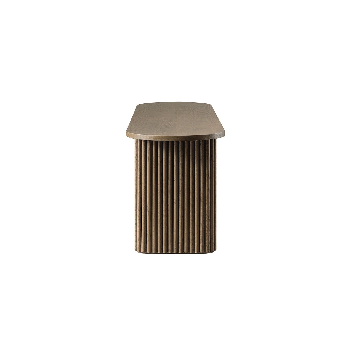 - Avec son plateau de forme ovale, ses pieds cylindriques cannelés et sa finition en bois aux tons froids, il équilibre la douceur avec la structure dans une forme à la fois moderne et intemporelle.