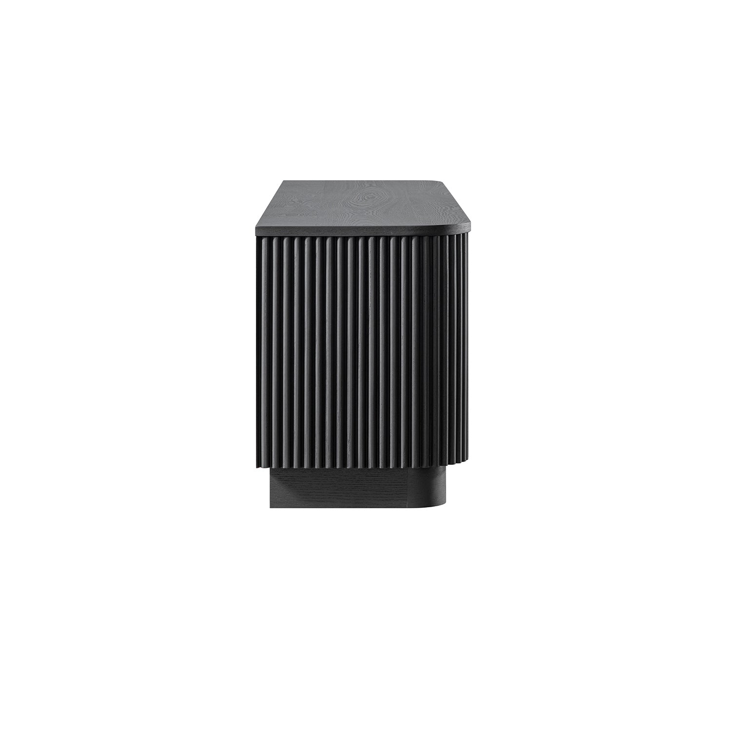 - Fabriqué en frêne massif et en placage de frêne, sa finition ébène met en valeur les cannelures verticales et la forme légèrement incurvée, créant une texture audacieuse et un rythme visuel épuré.