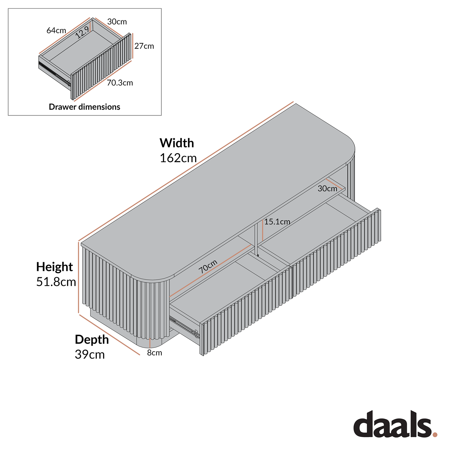 - Avec ses 162 cm de large, il est parfaitement proportionné pour les téléviseurs moyens à grands et fonctionne aussi bien comme buffet bas dans des espaces apaisants et contemporains.