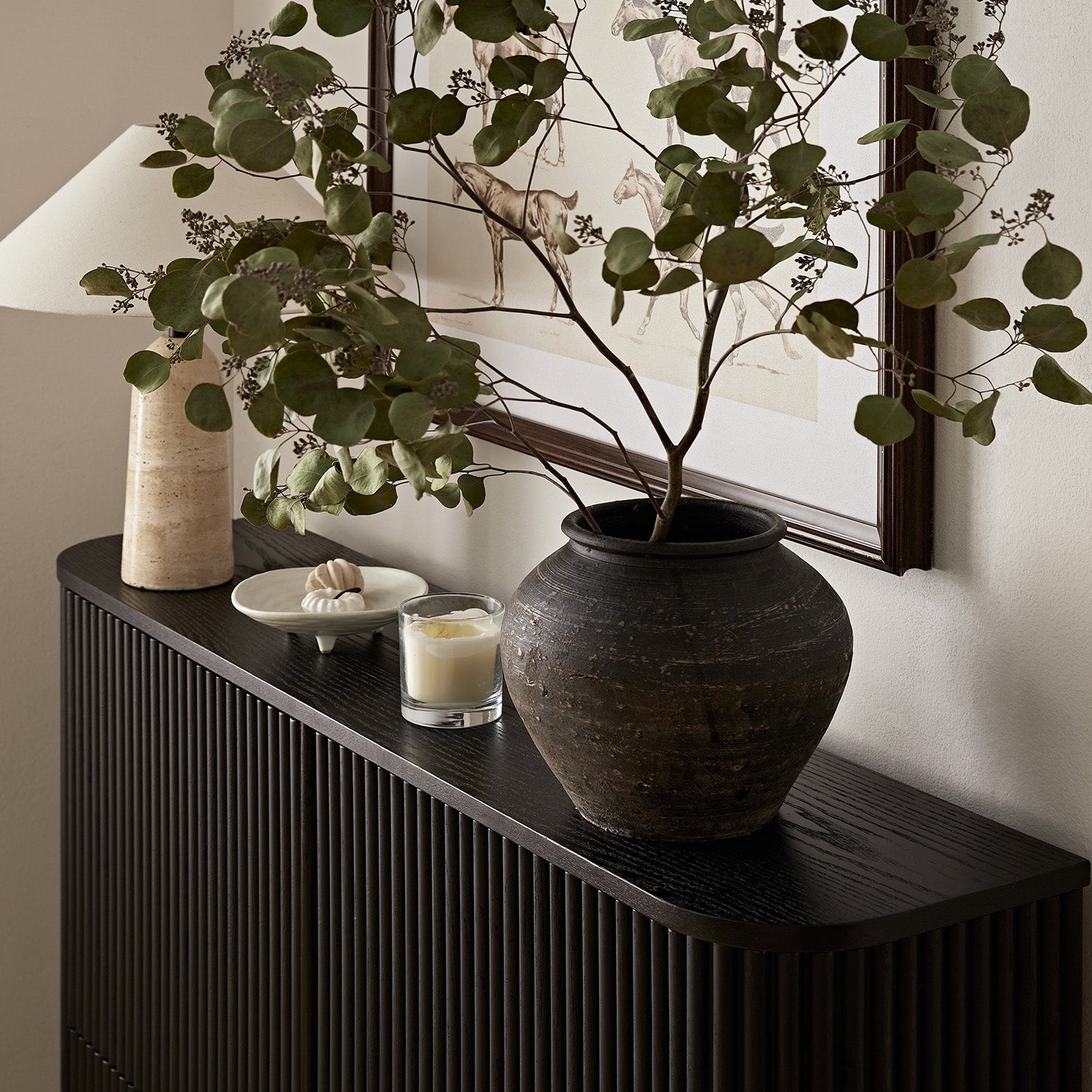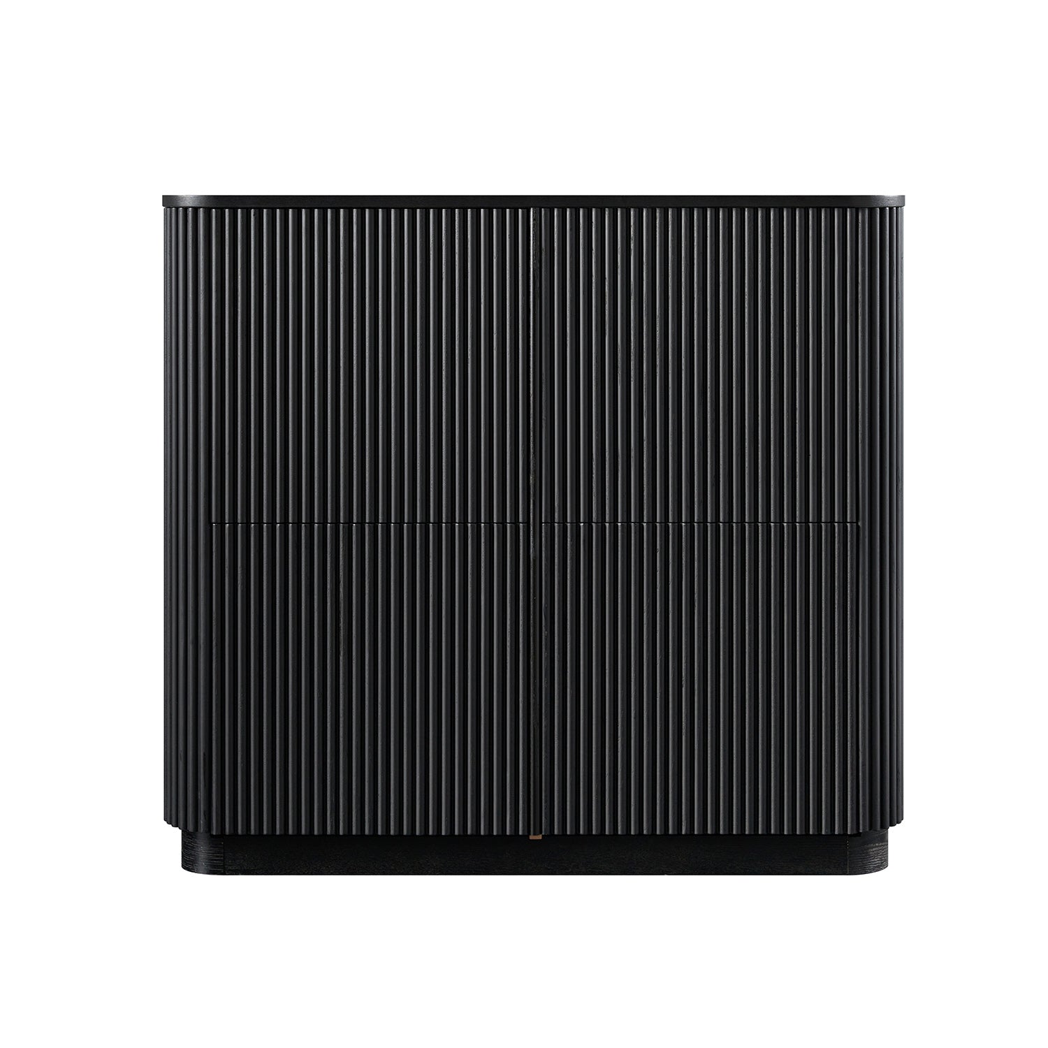 - La finition ébène apporte un contraste spectaculaire tout en soulignant la beauté rythmique de ses détails cannelés verticaux, créant une solution de rangement frappante mais polyvalente pour les intérieurs modernes.