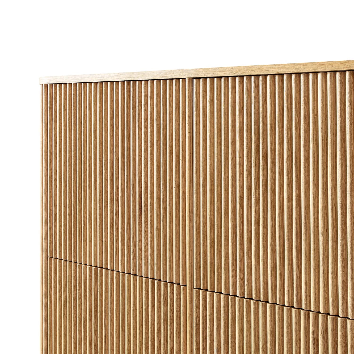 - Fini dans un placage de chêne naturel chaleureux avec un grain visible, l'armoire Maru équilibre douceur et structure, fondée sur une base de socle encastrée qui ajoute de la légèreté à la silhouette tout en assurant la stabilité.