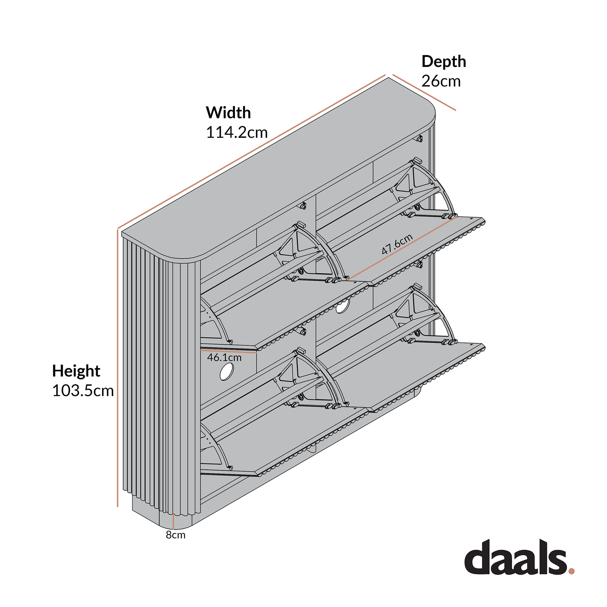 - Derrière quatre portes sans poignée à ouverture par simple pression, cette armoire comprend 4 compartiments, chacun abritant un support à chaussures à double étagère conçu pour stocker jusqu'à 12 à 16 paires de chaussures selon la taille et le style.