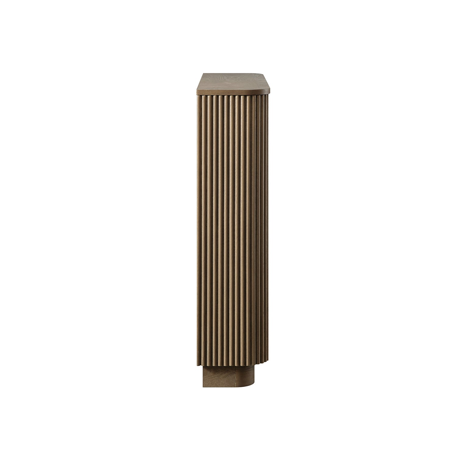 - Sa façade en bois cannelé crée une sensation de mouvement et de texture tranquilles, tandis que des bords doux et une silhouette épurée lui permettent de s'intégrer naturellement dans les intérieurs minimalistes et design.