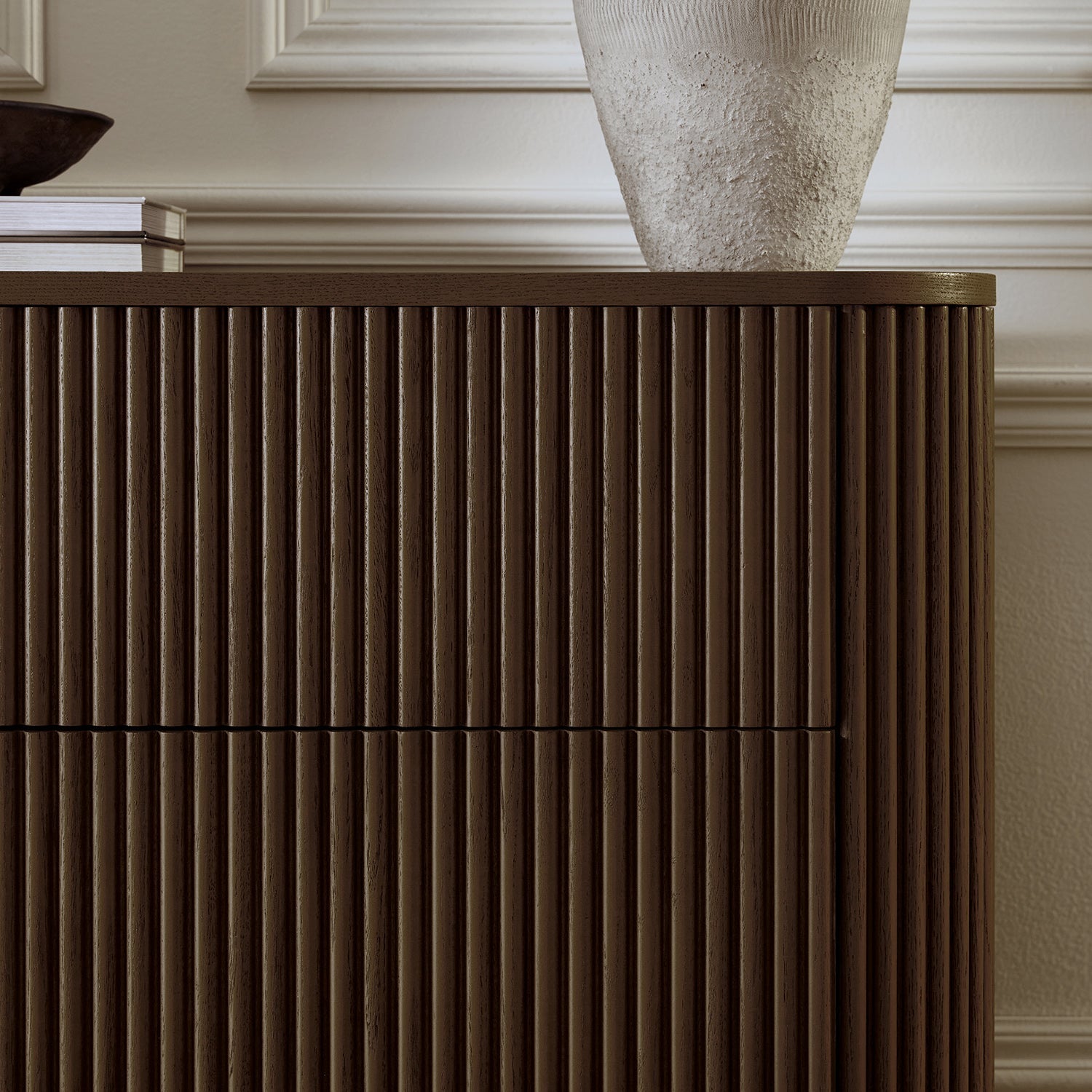 - Un ajout audacieux mais équilibré à la collection Maru, la commode à 3 tiroirs en chêne argenté combine des détails sculpturaux avec un rangement généreux.
