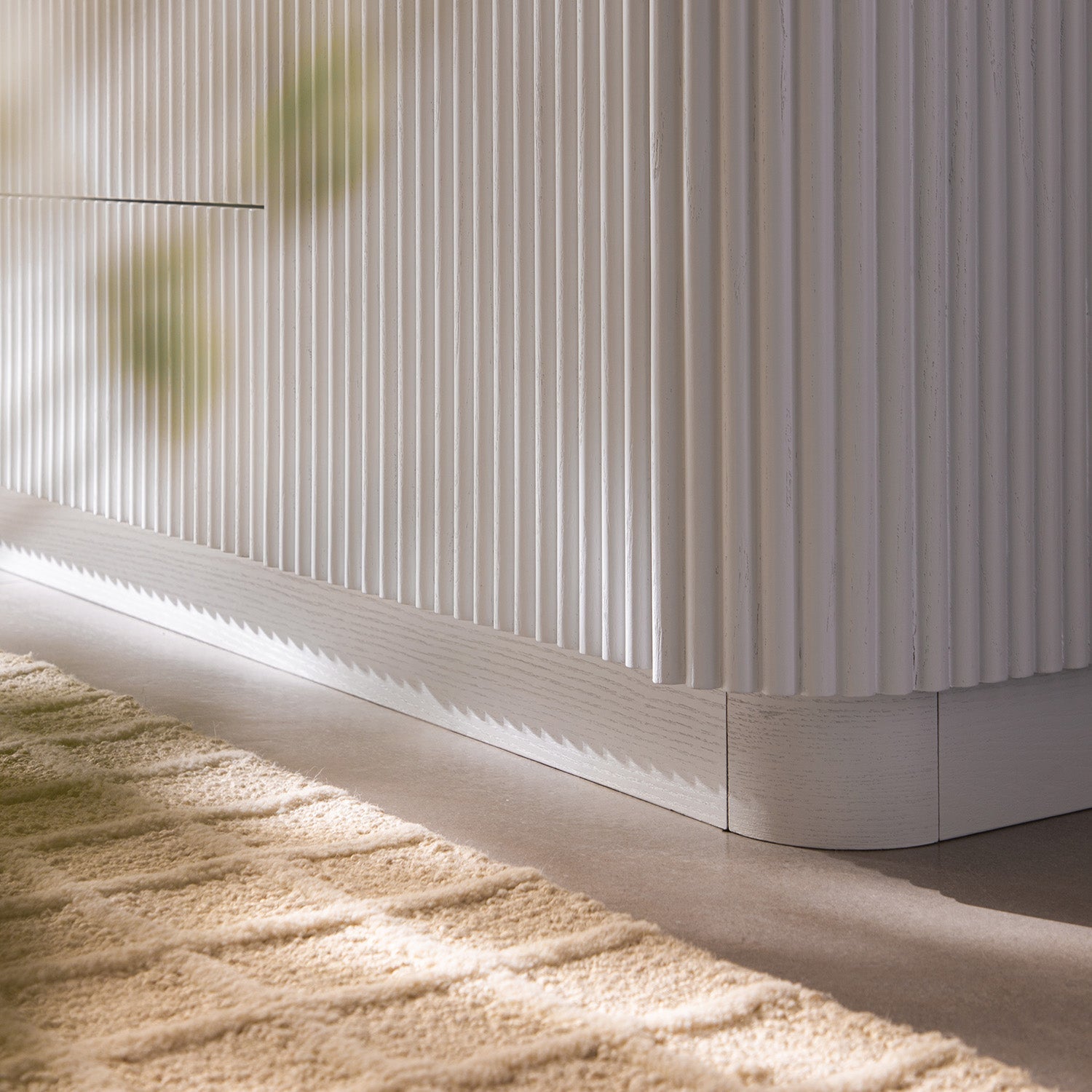 - Les façades sans poignée sont fabriquées à partir de cannelures en frêne massif, préservant la façade ininterrompue , tandis que la base du socle encastré ajoute de l'élévation à la silhouette.