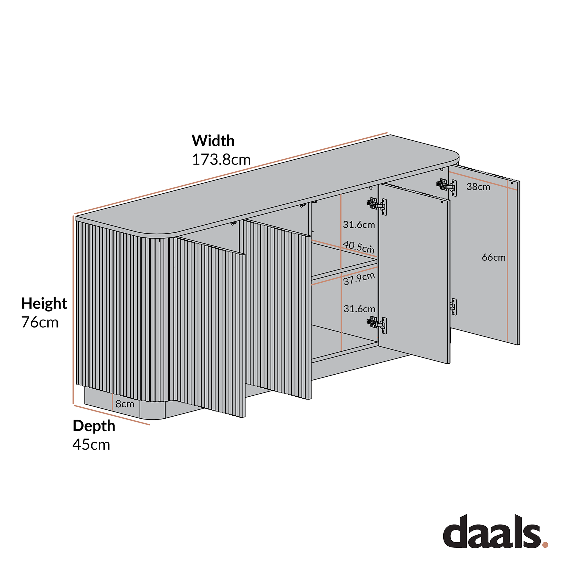 - Avec une largeur de 173 cm, ce buffet offre à la fois un équilibre visuel et une profondeur fonctionnelle, idéal comme pièce maîtresse dans les salles à manger, les espaces de vie ou les larges entrées.