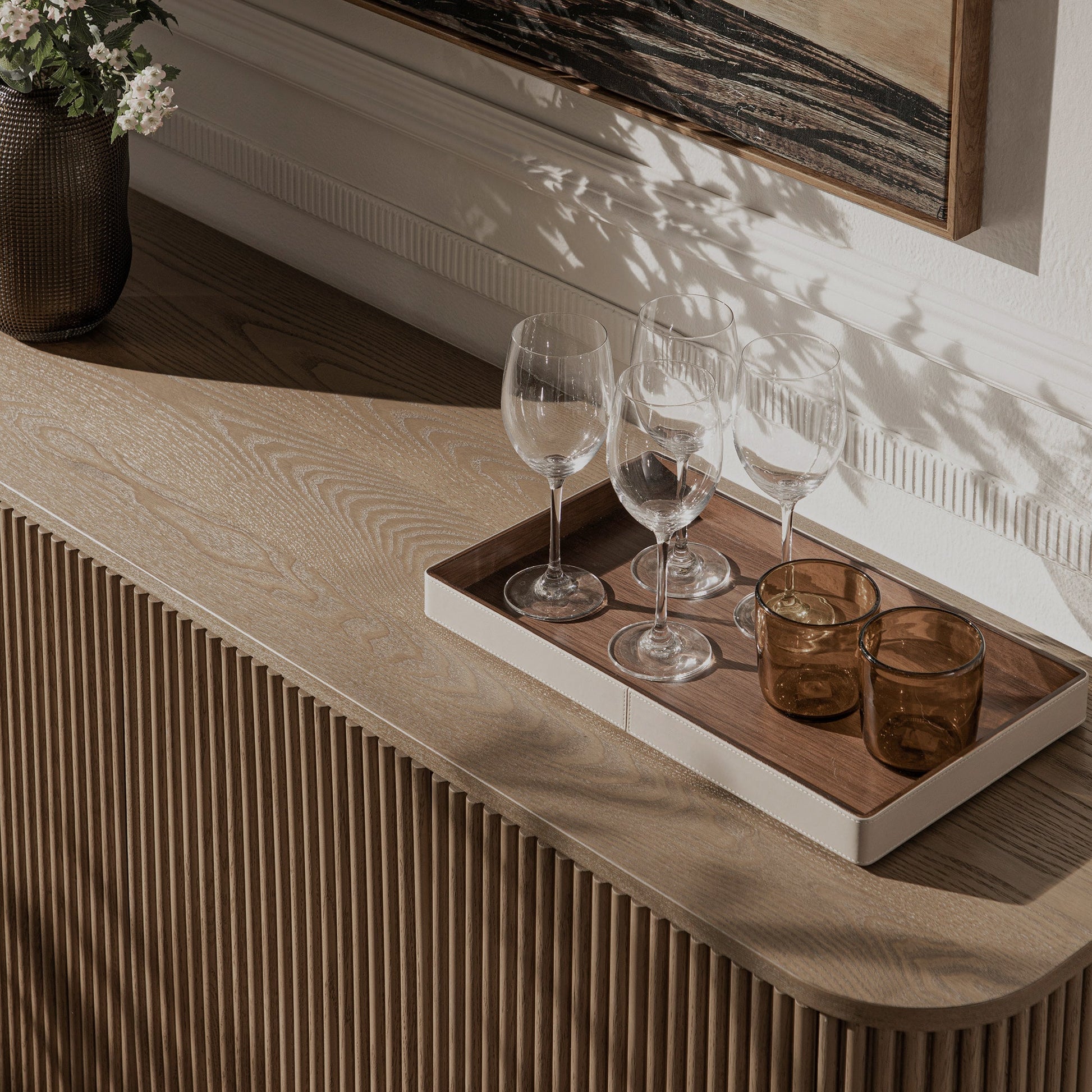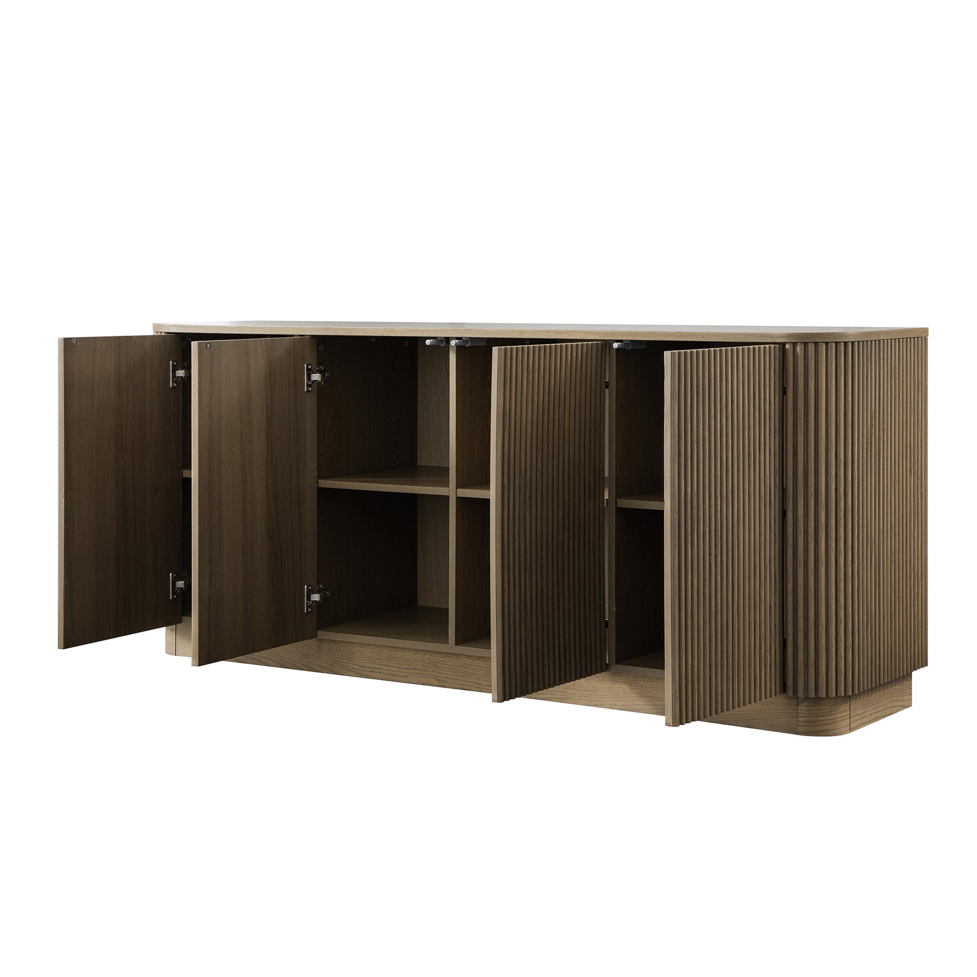 - D'une grande envergure et d'une présence architecturale, notre buffet large à 4 portes Maru en chêne argenté est une leçon de maître en rythme raffiné et en design fonctionnel.