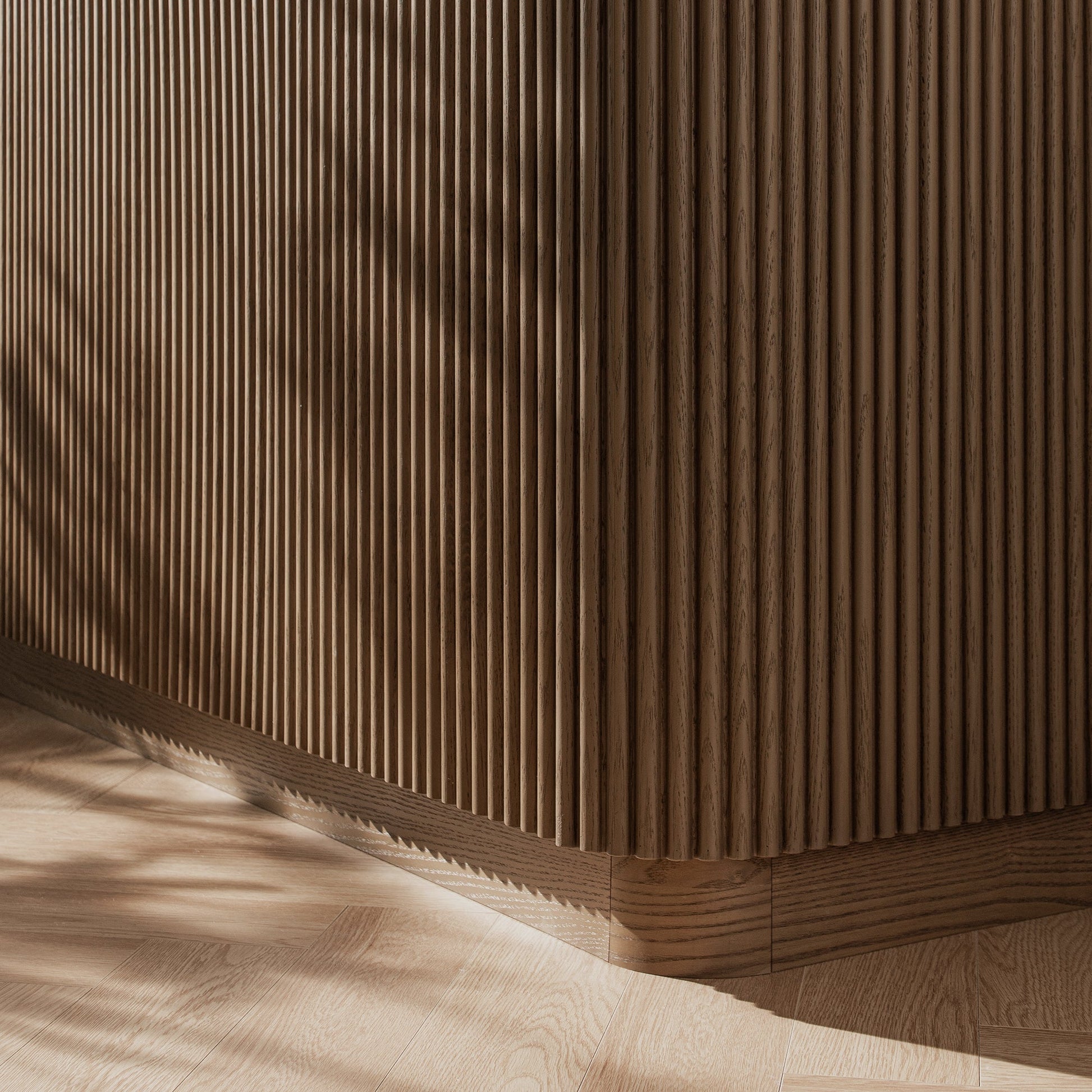 - La façade cannelée emblématique s'écoule harmonieusement sur quatre portes sans poignée, encadrées par des coins légèrement arrondis et ancrées par une base de socle encastrée.