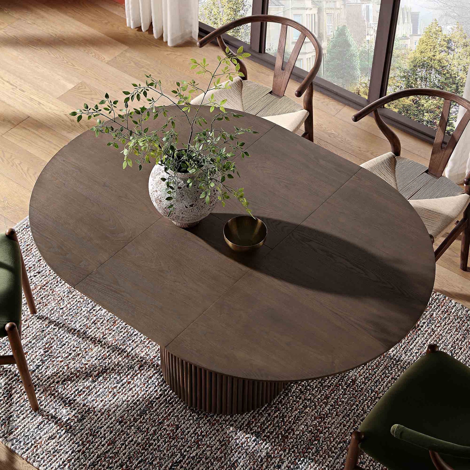 - Notre table à manger Maru arbore un style Japandi contemporain avec un piètement cannelé en chêne massif. Grâce à sa conception extensible, elle peut accueillir jusqu'à 6 personnes.