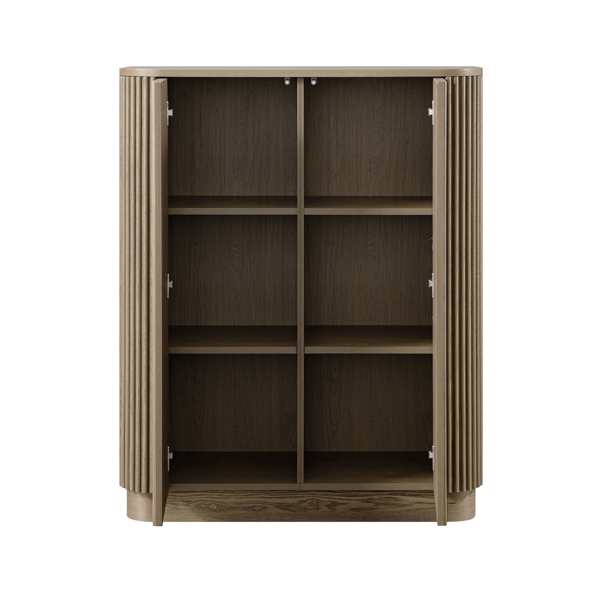 - L'armoire est dotée de cannelures entièrement en frêne massif sur 3 surfaces verticales, tandis que la base du socle encastré offre un soulèvement subtil.