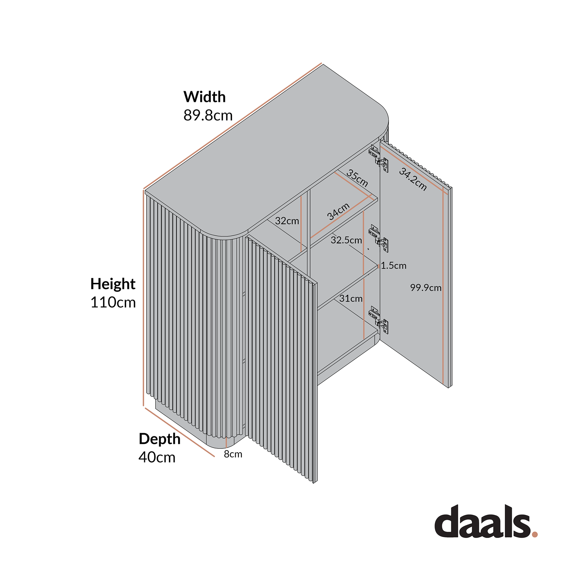 - L'armoire est dotée de cannelures entièrement en frêne massif sur 3 surfaces verticales, tandis que la base du socle encastré offre un soulèvement subtil.