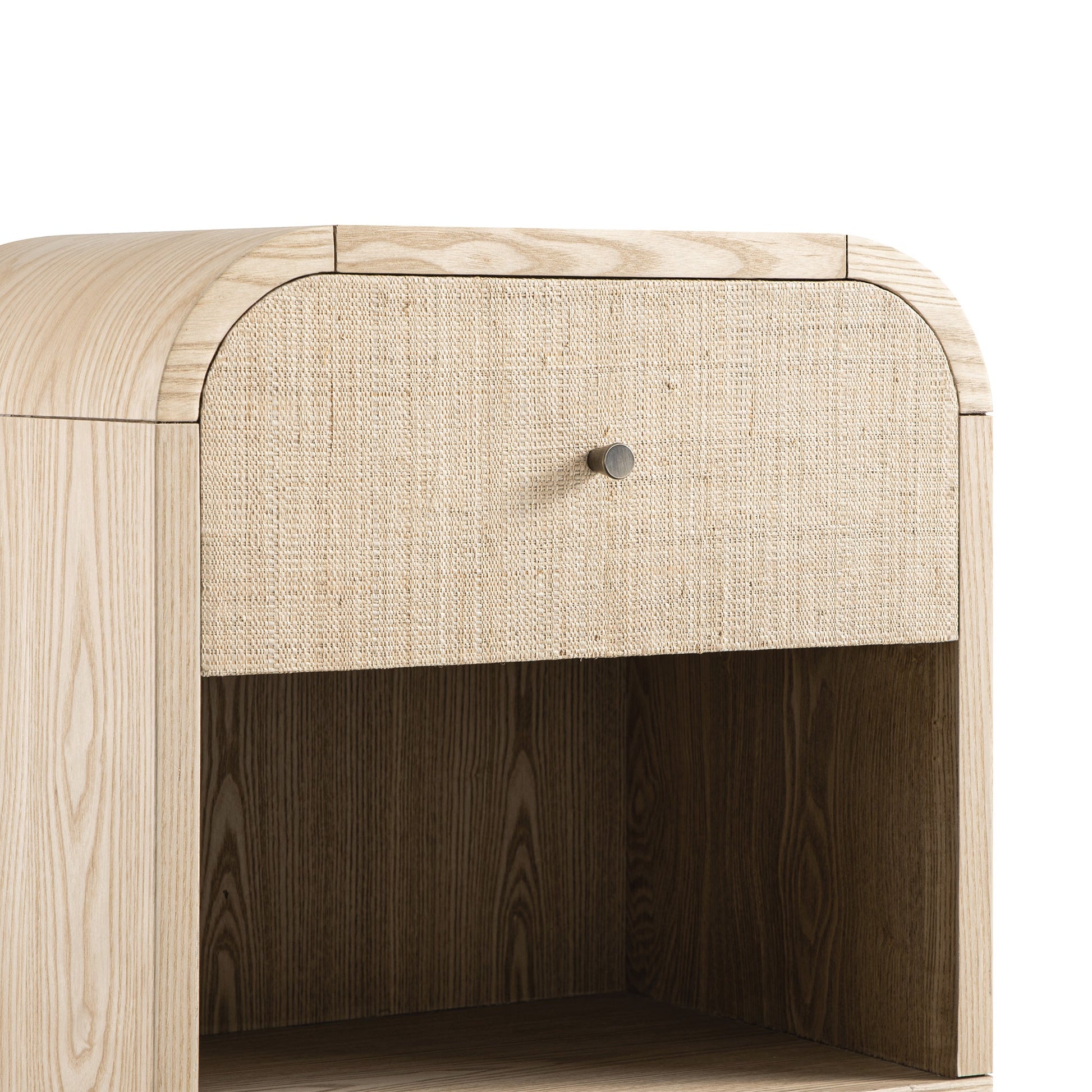- Le cadre en frêne est fini avec une laque transparente pour mettre en valeur son grain chaud et organique, tandis que le tiroir à façade en raphia ajoute un contraste tactile et aéré.