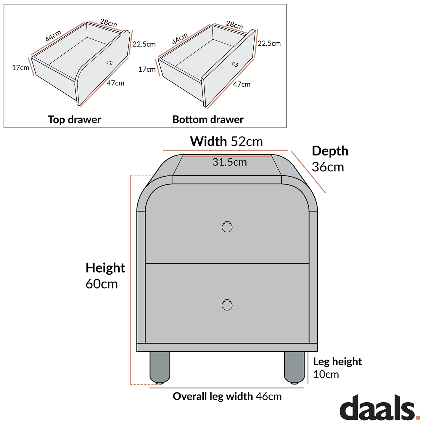 - Compacts mais fonctionnels, les deux tiroirs offrent un rangement discret pour vos essentiels du coucher, tandis que les poignées en métal ajoutent un contraste subtil.