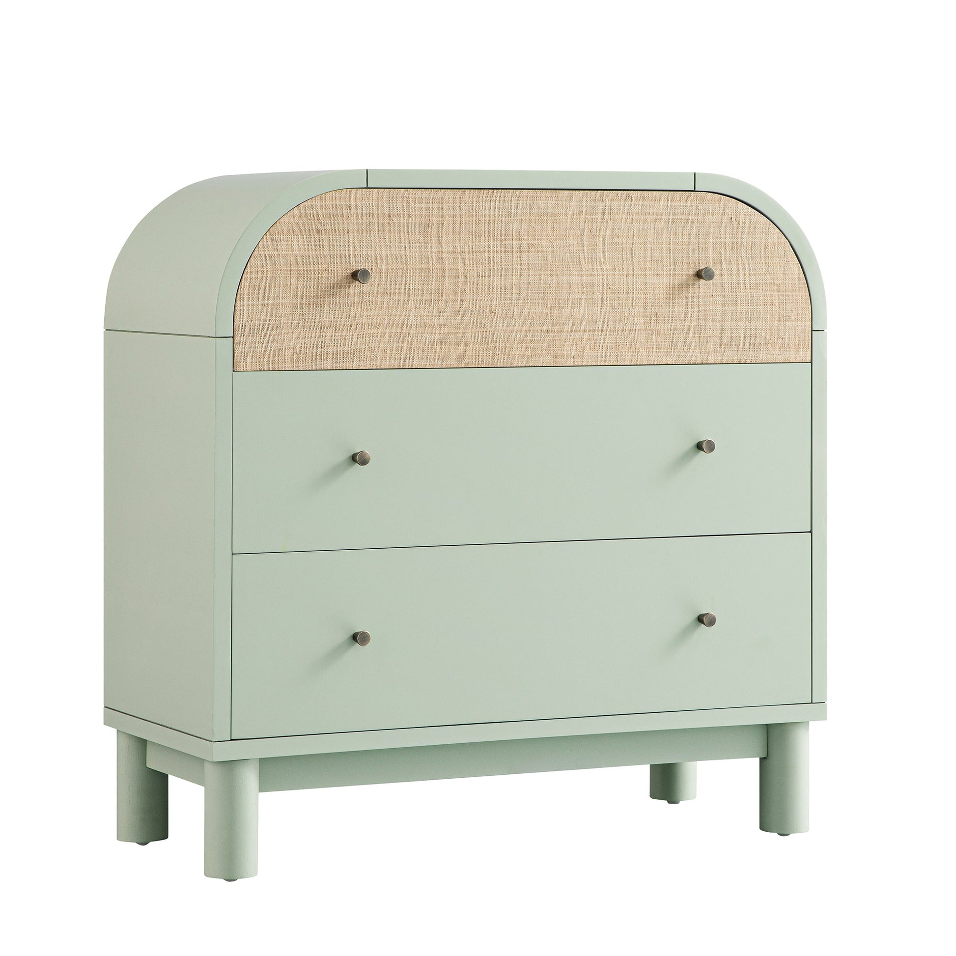 - Conçue pour apporter calme et caractère à votre chambre, notre commode Maude en pistache douce associe une finition peinte verte mate douce à un tiroir supérieur en raphia texturé pour un contraste subtil.