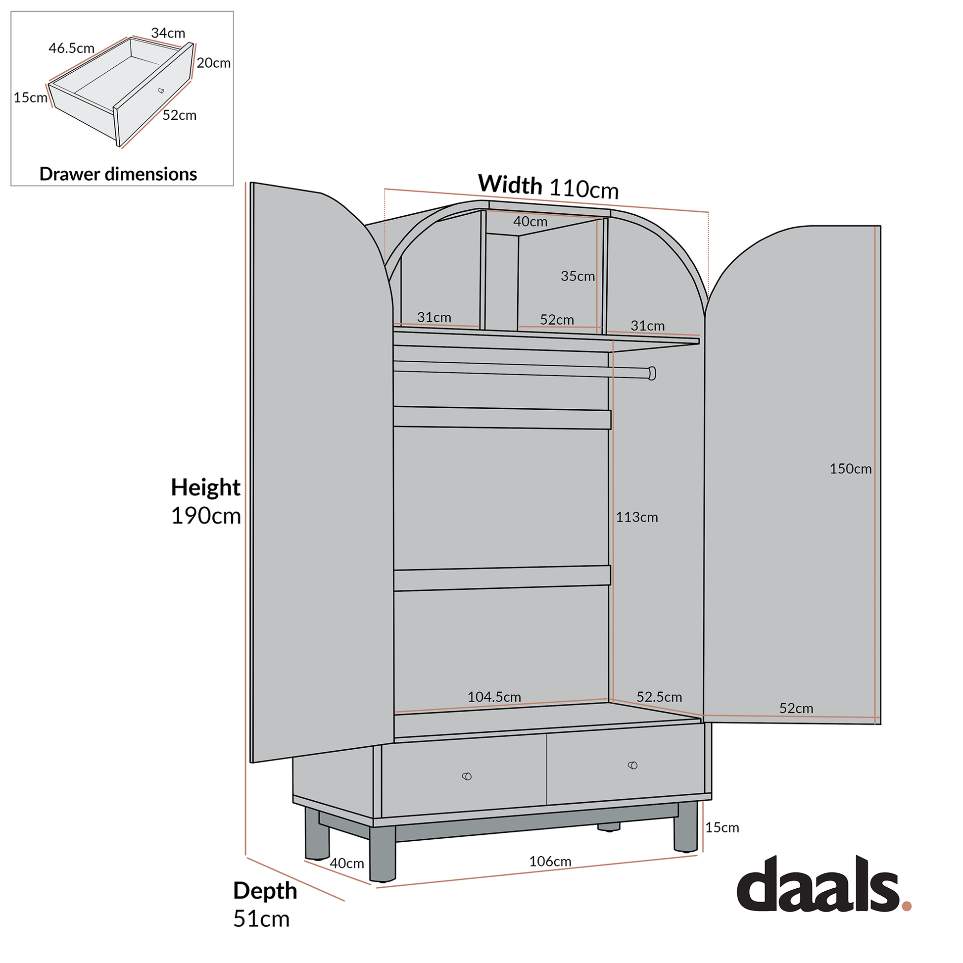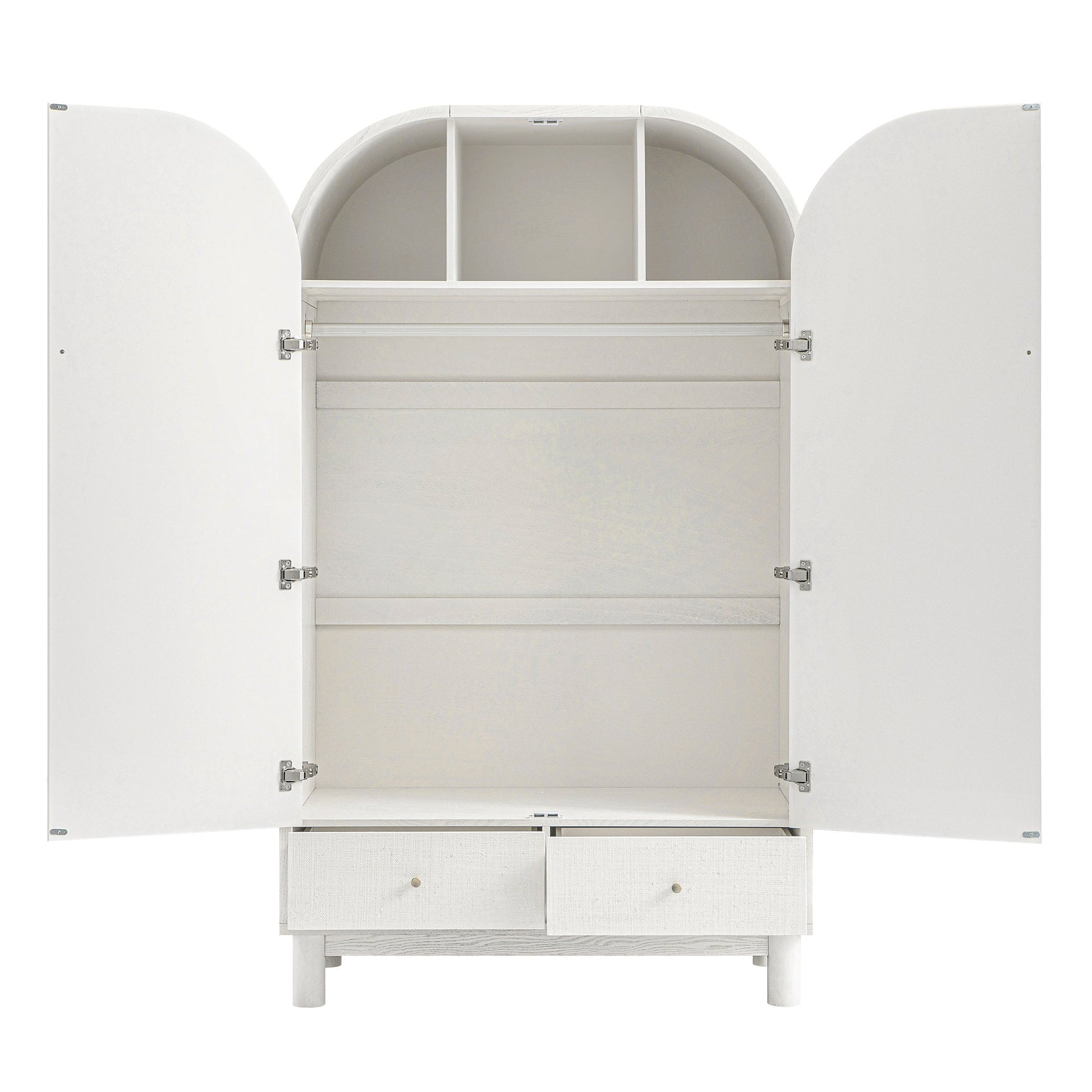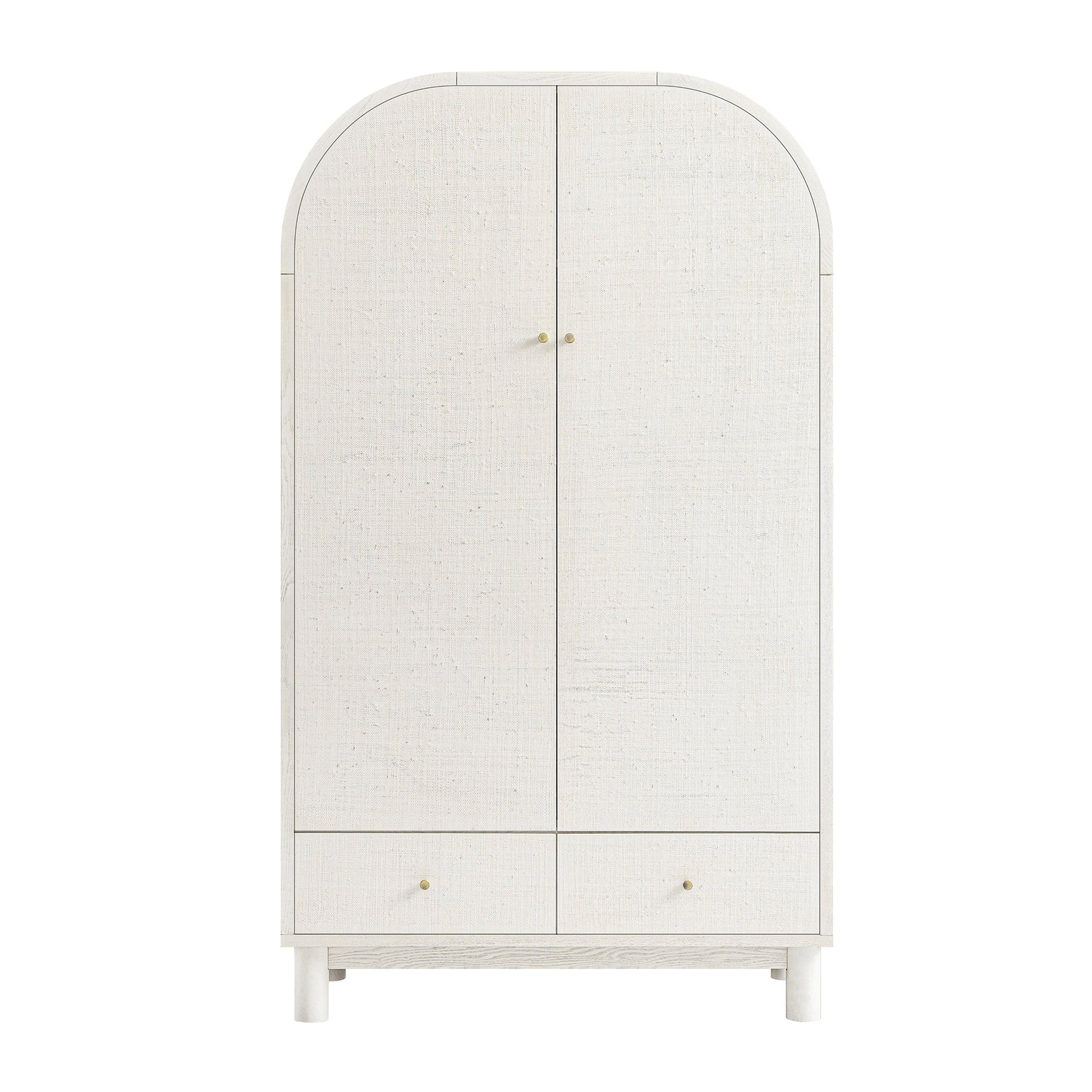 - Les portes pleine hauteur s'ouvrent pour révéler une tringle de suspension spacieuse et des casiers supérieurs pour les accessoires ou le rangement saisonnier, tandis que deux tiroirs inférieurs offrent un espace supplémentaire pour les vêtements pliés ou le linge de maison.