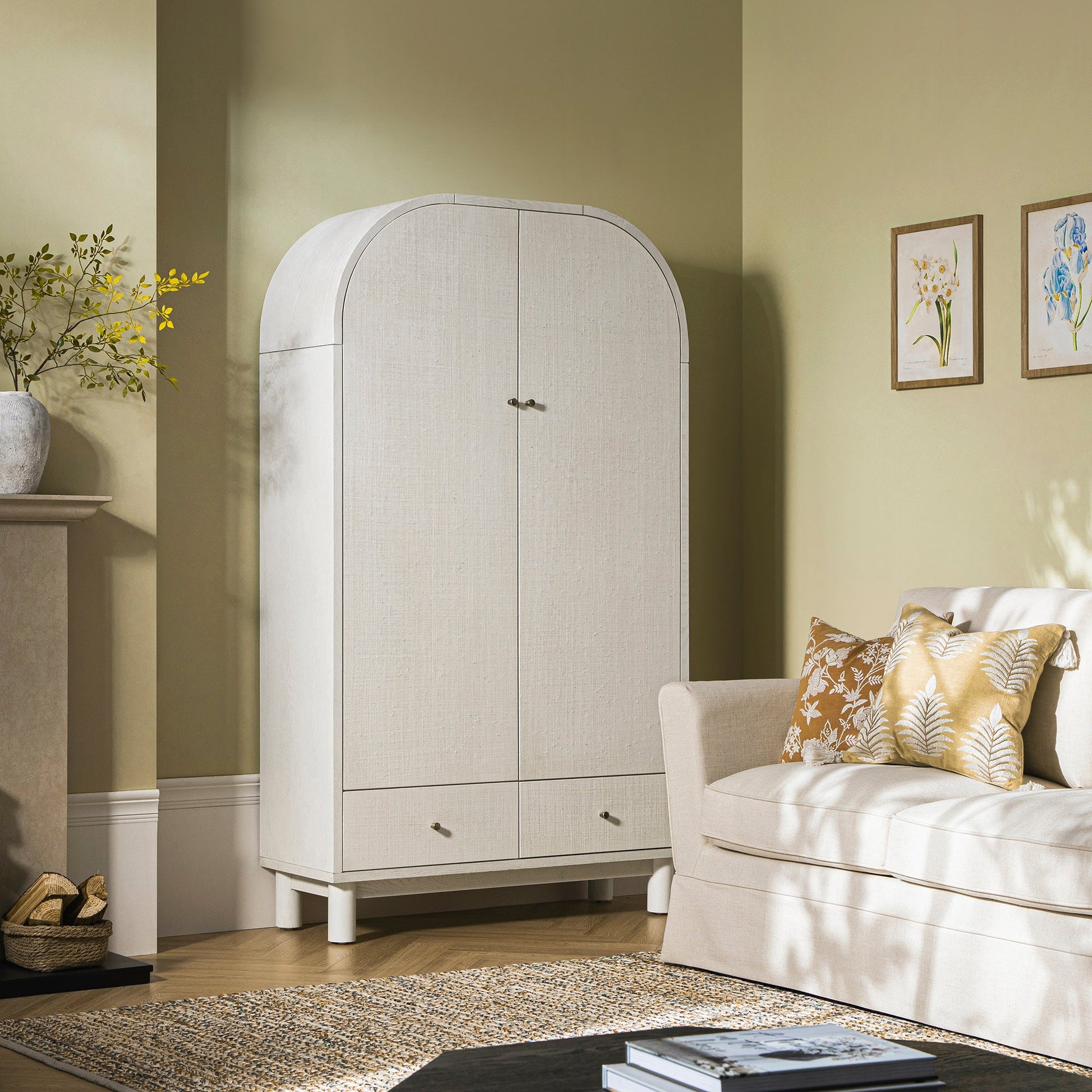 - Complétez le look : sur la photo avec notre grand meuble de rangement Maude, vous trouverez notre canapé 2 places à jupe Fitz , notre tapis en jute tressé à la main Aurora en bronze et bleu sarcelle , notre coussin brodé à la main Vine Collection Green Palms et notre coussin floral Aubrey Collection
