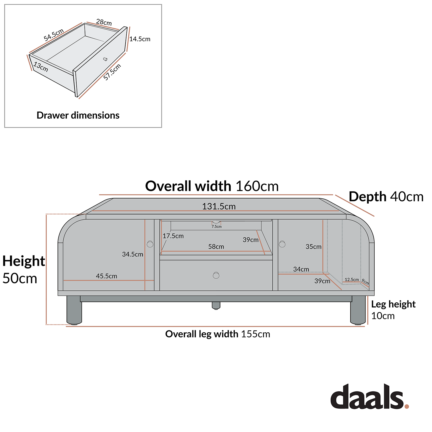 - Espace de rangement intérieur du tiroir : L 54,5 x P 28,0 x H 13,0 cm