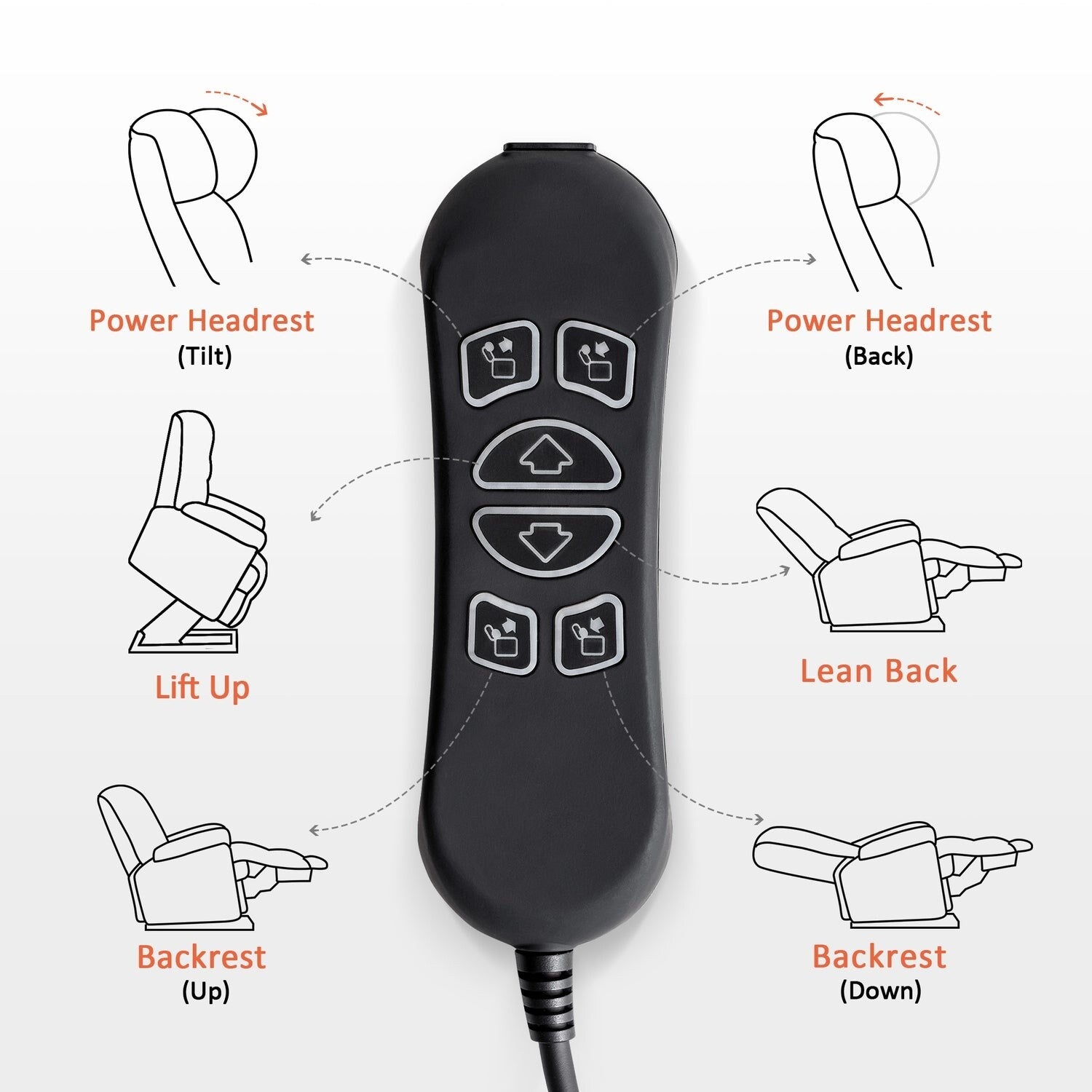 - Appuie-tête électrique : Si les appuie-tête réglables peuvent être utilisés pour un confort personnalisé en position assise droite, ils sont spécialement conçus pour permettre à une personne inclinée de regarder droit devant elle (par exemple, vers la télévision) sans se faire mal à la tête ni au cou.