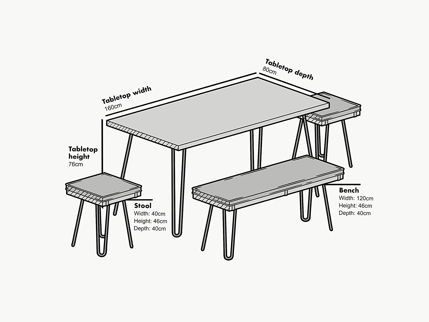 - Dimensions de la table : L 160 x P 80 x H 76 cm / Dimensions du tabouret : L 40 x P 40 x H 46 cm / Dimensions du banc : L 120 x P 40 x H 46 cm.