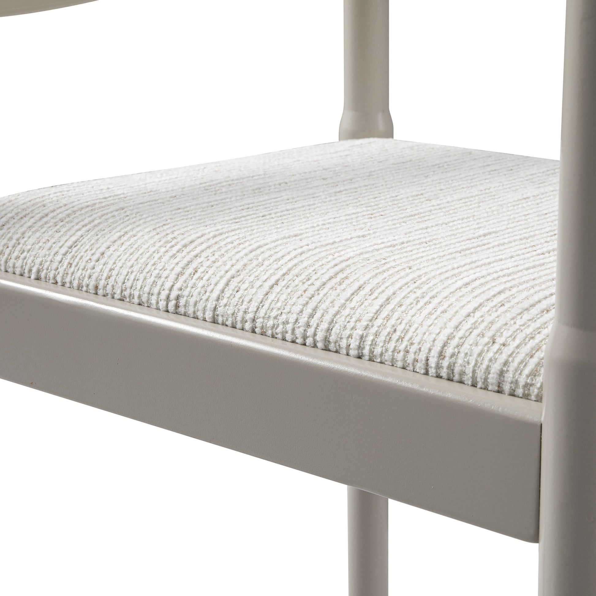 - Chaque chaise est ingénieusement conçue avec deux coussins d'assise : l'un rembourré et recouvert d'un magnifique tissu texturé bouclé beige, l'autre recouvert d'un cordon tressé en papier naturel. Les coussins sont interchangeables selon la météo ou les préférences des invités.