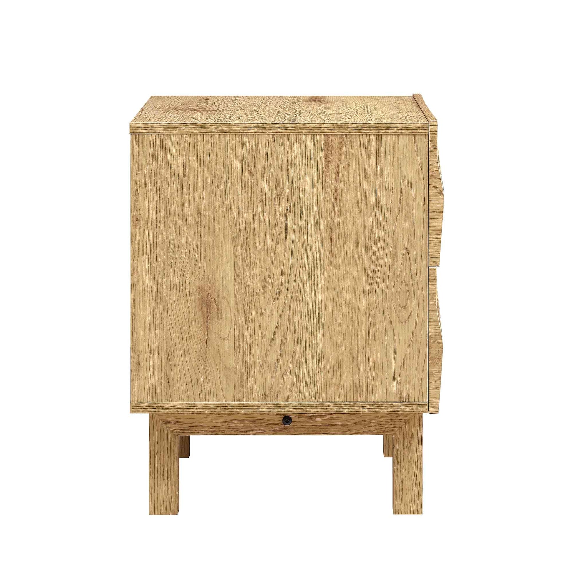 - La façade sculpturale unique présente des vagues fluides sur le devant de la table de chevet, dissimulant astucieusement les portes des tiroirs.