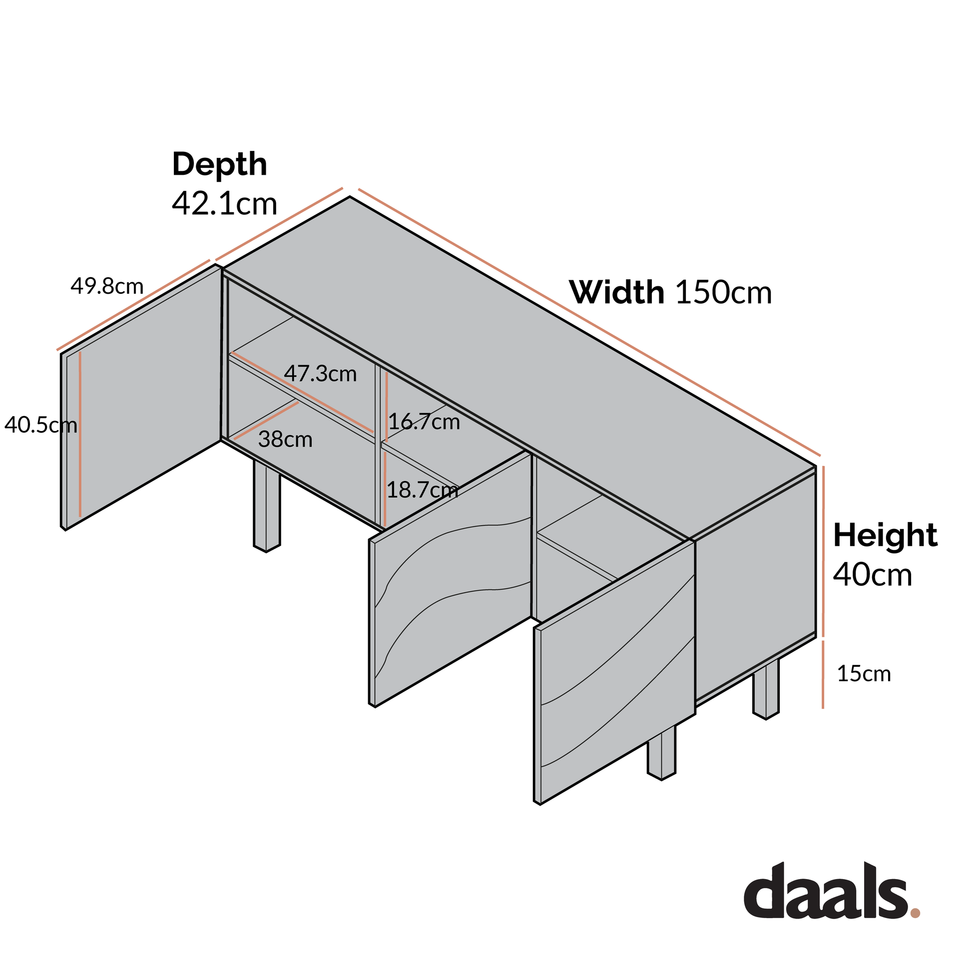 - Le meuble TV de 150 cm de large dispose de 3 portes s'ouvrant sur de nombreux rangements intérieurs, avec des étagères réglables pour un rangement pratique et 3 ouvertures à l'arrière pour la gestion des câbles.
