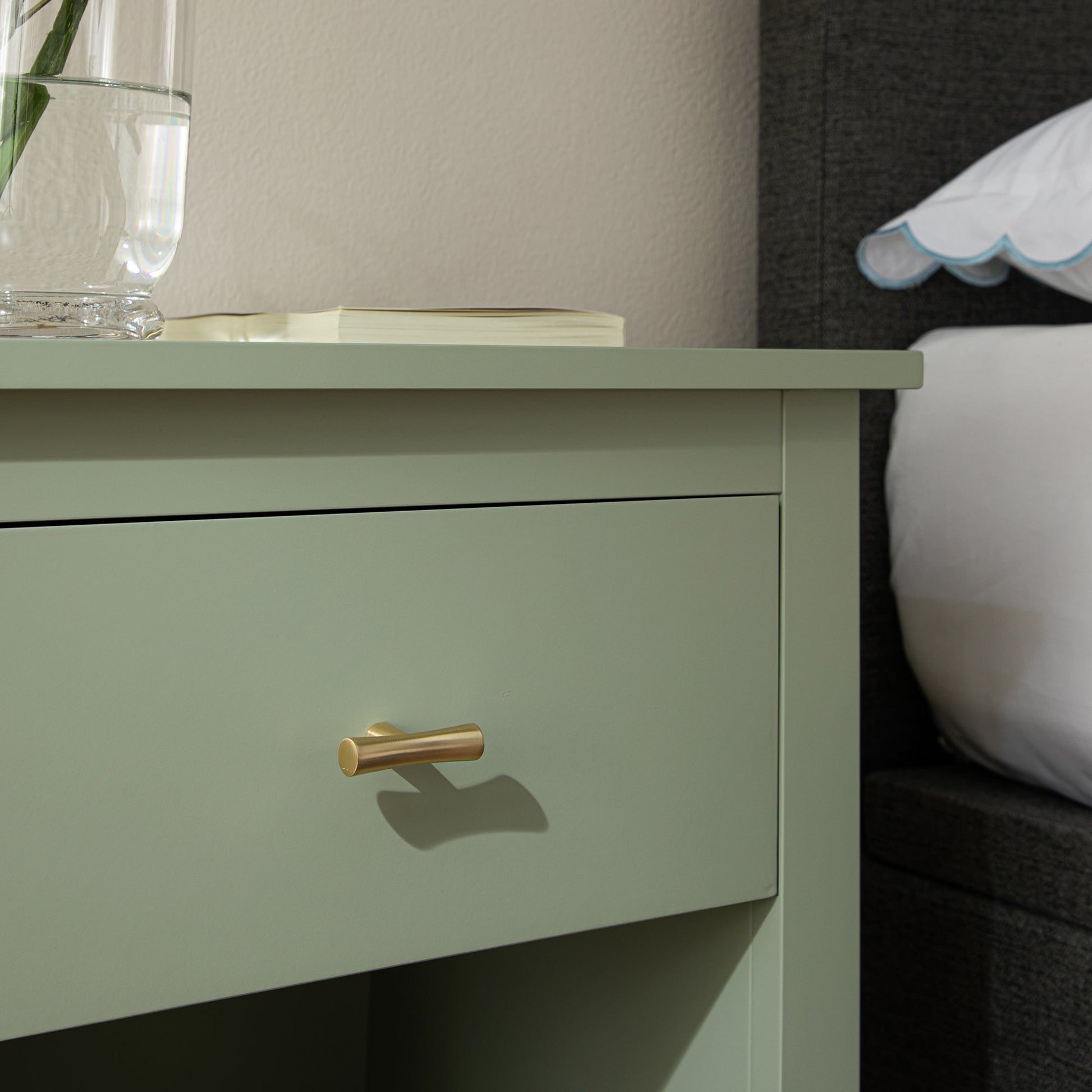 - Complétez le look : sur la photo avec la table de chevet Oakham Desert Sage se trouvent notre coussin vert 100 % lin à rayures Pembroke , notre lit de rangement ottoman rembourré gris foncé Chilworth et notre ensemble de couette festonné brodé bleu Bluebell Margot .