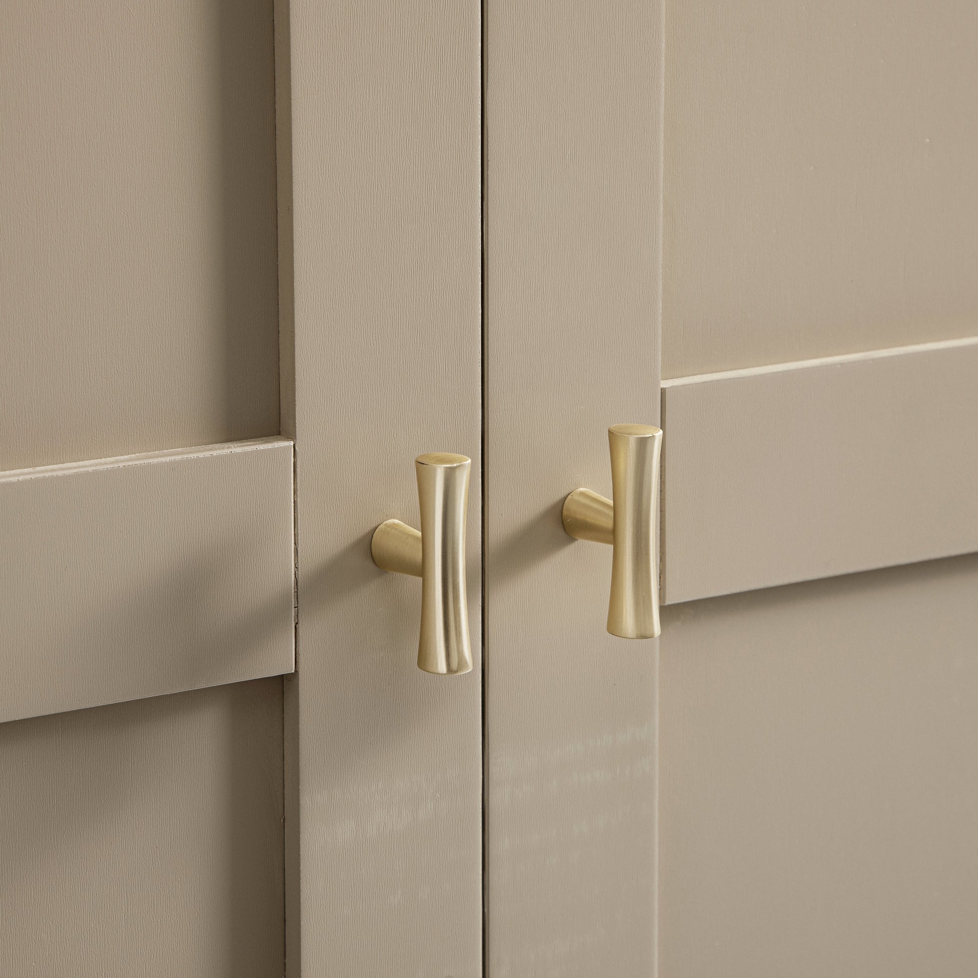 - Les portes à double panneau s'ouvrent en douceur pour révéler l'espace intérieur, tandis que les poignées en T dorées ajoutent une touche subtile de raffinement.