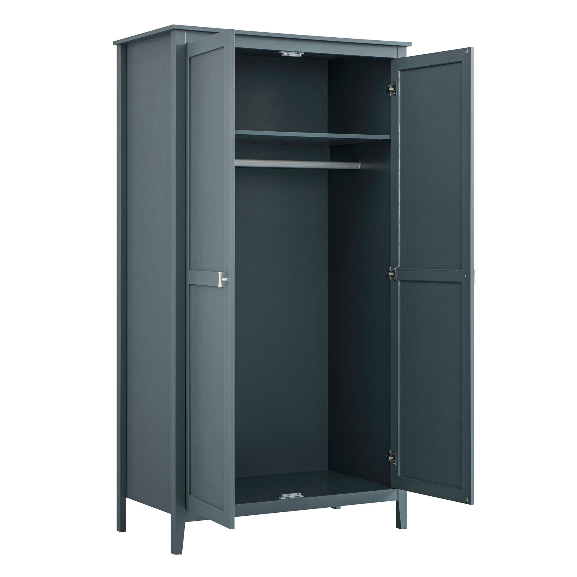 - Avec ses lignes épurées et sa finition froide aux tons ardoise, notre armoire double Oakham en bleu orageux apporte une sensation raffinée de calme à la chambre.