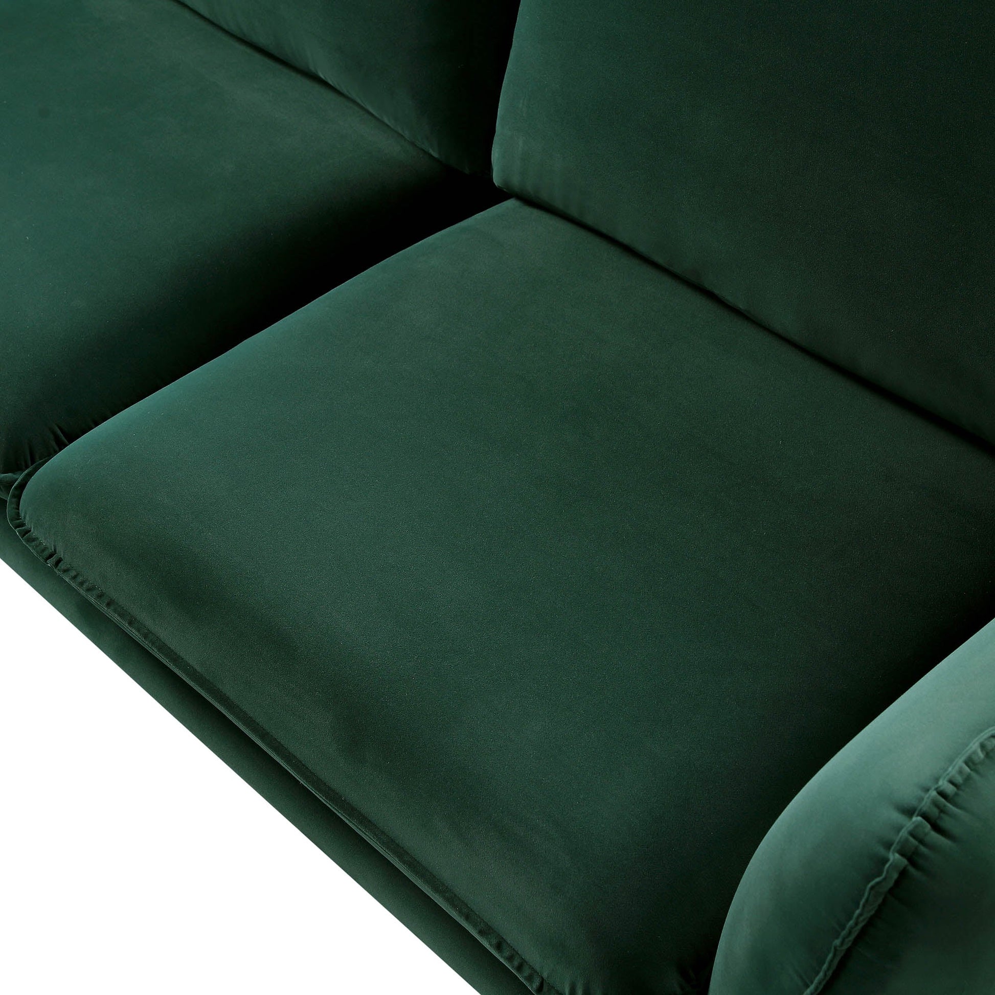 - Complétez le look : sur la photo avec notre canapé d'angle Obriel Forest Green Velvet Grande, vous trouverez notre tapis en laine à pompons aigue-marine tissé à la main Avanti