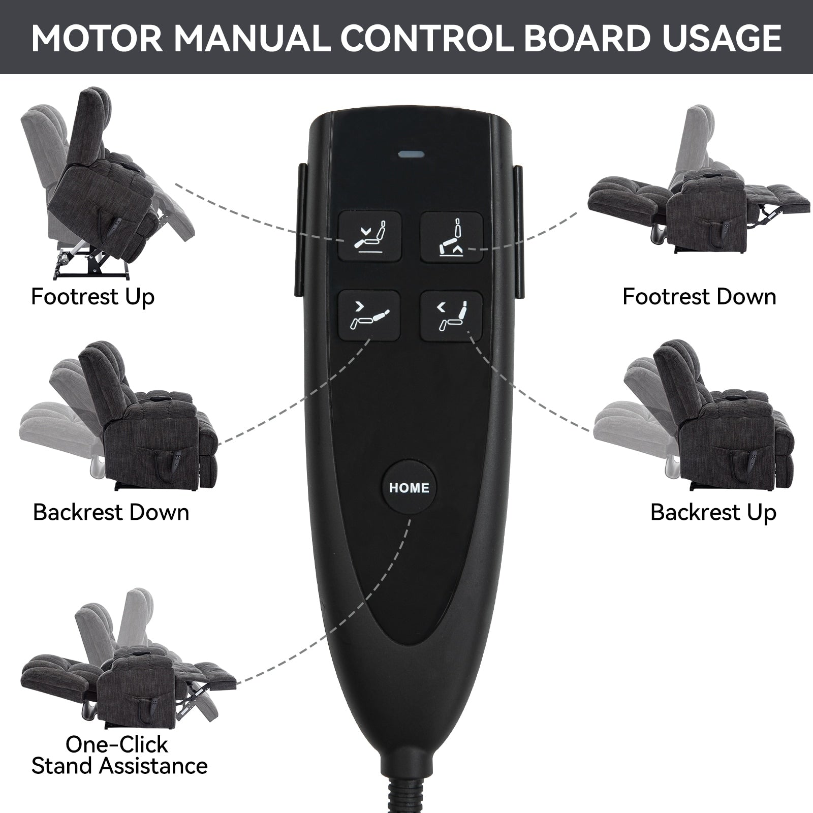 - Fauteuil releveur électrique à double moteur : Ce fauteuil est équipé d’un système à double moteur permettant de régler indépendamment le dossier et le repose-pieds. D’une simple pression sur la télécommande, vous pouvez incliner le fauteuil jusqu’à près de 180 degrés ou activer la fonction releveur, qui facilite le lever en douceur et en silence. Idéal pour les personnes âgées, les personnes souffrant de problèmes d’équilibre au niveau des jambes ou du dos, ou celles en convalescence.