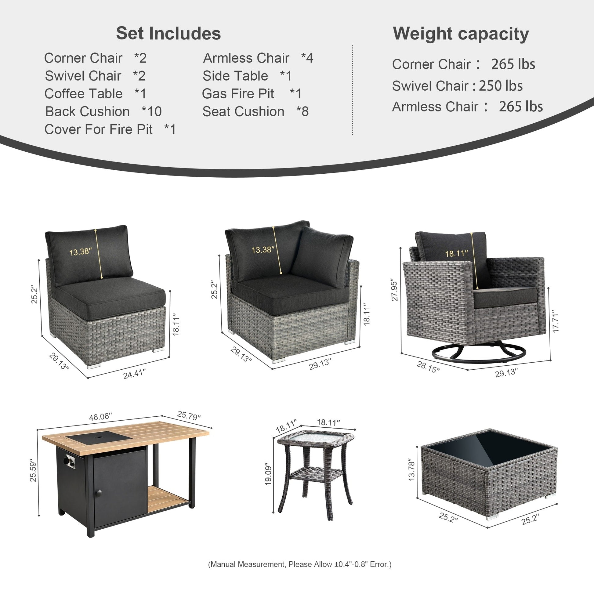 Ensemble de canapé d'angle 11 pièces en résine tressée avec assise profonde, fauteuils pivotants et foyer extérieur OVIOS