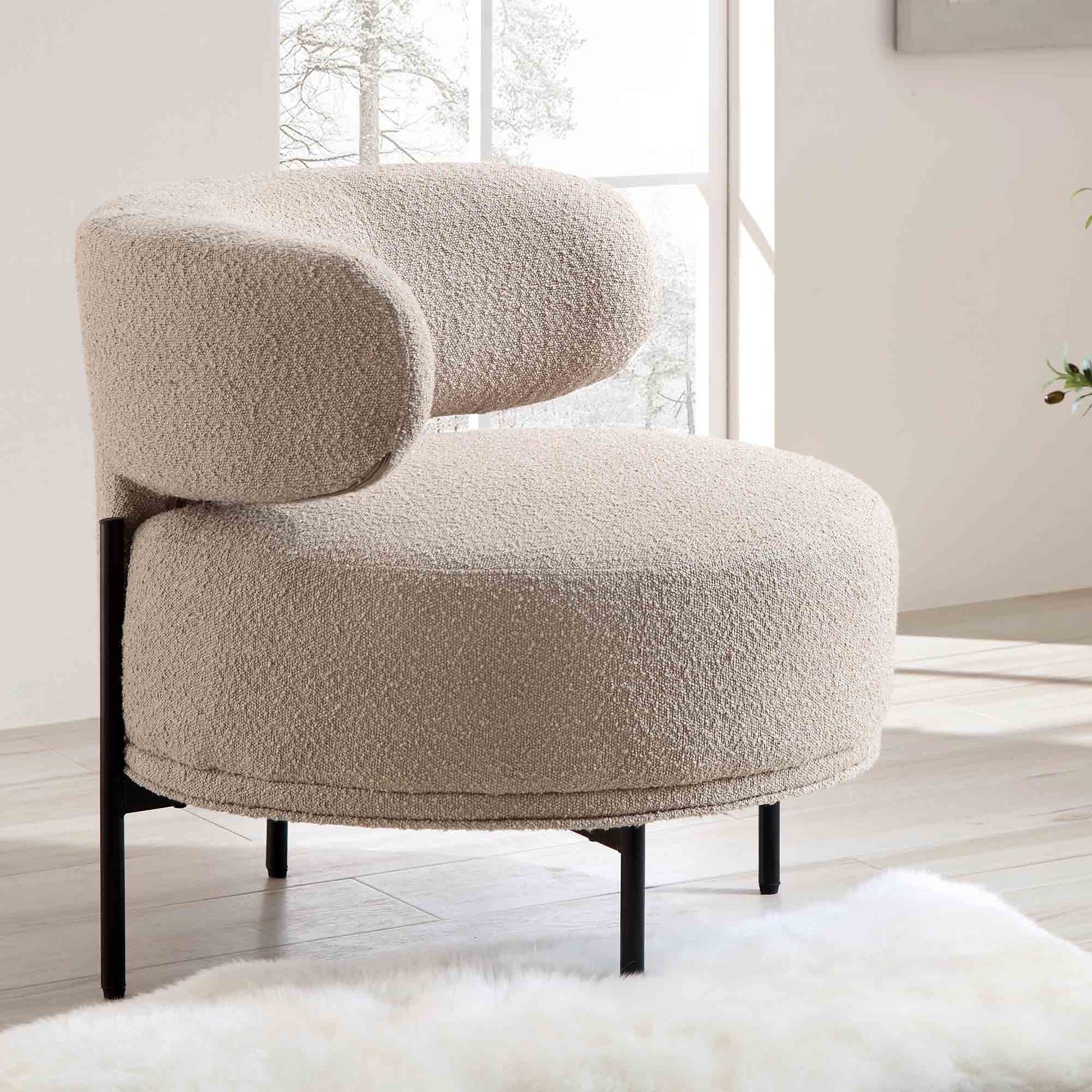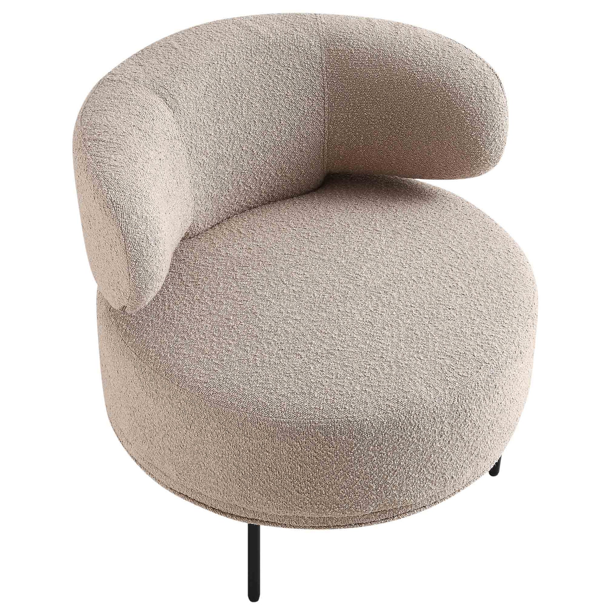 - Le siège épais est bien rembourré et recouvert d'un tissu bouclé texturé de couleur sable, associé à des pieds métalliques minces finis en noir mat pour un look sophistiqué.