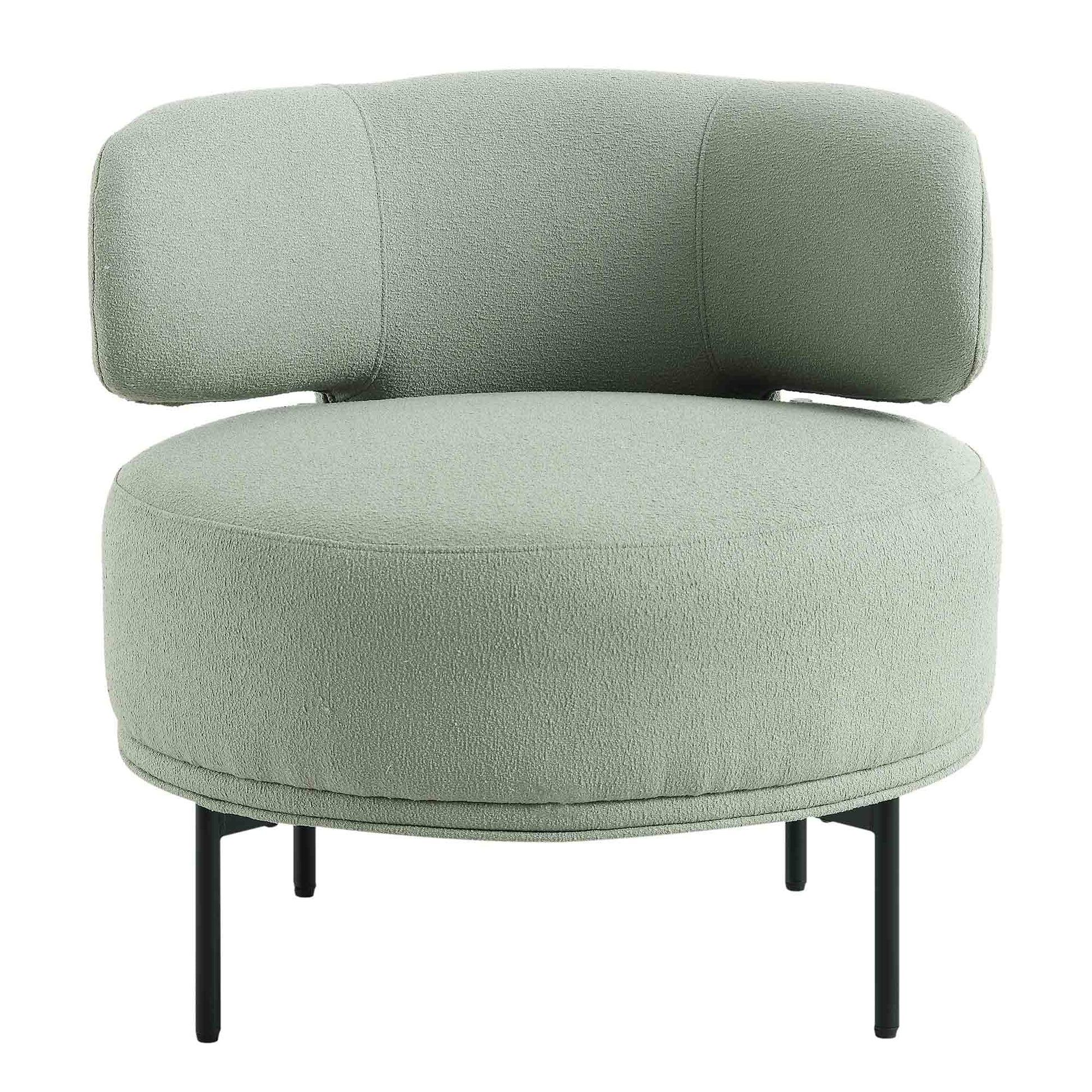 - Le siège épais est bien rembourré et recouvert d'un tissu bouclé texturé de couleur vert clair, associé à des pieds métalliques minces finis en noir mat pour un look sophistiqué.