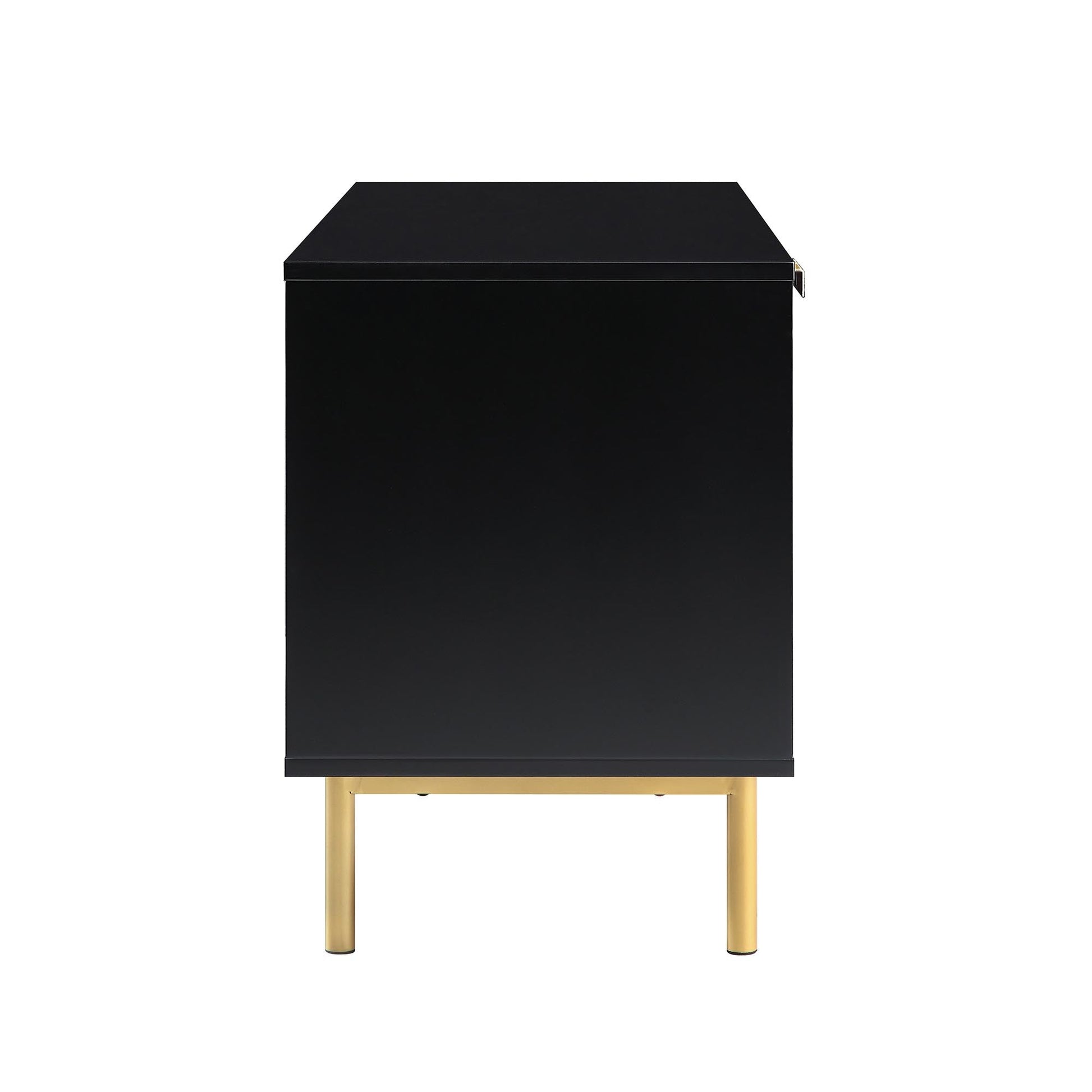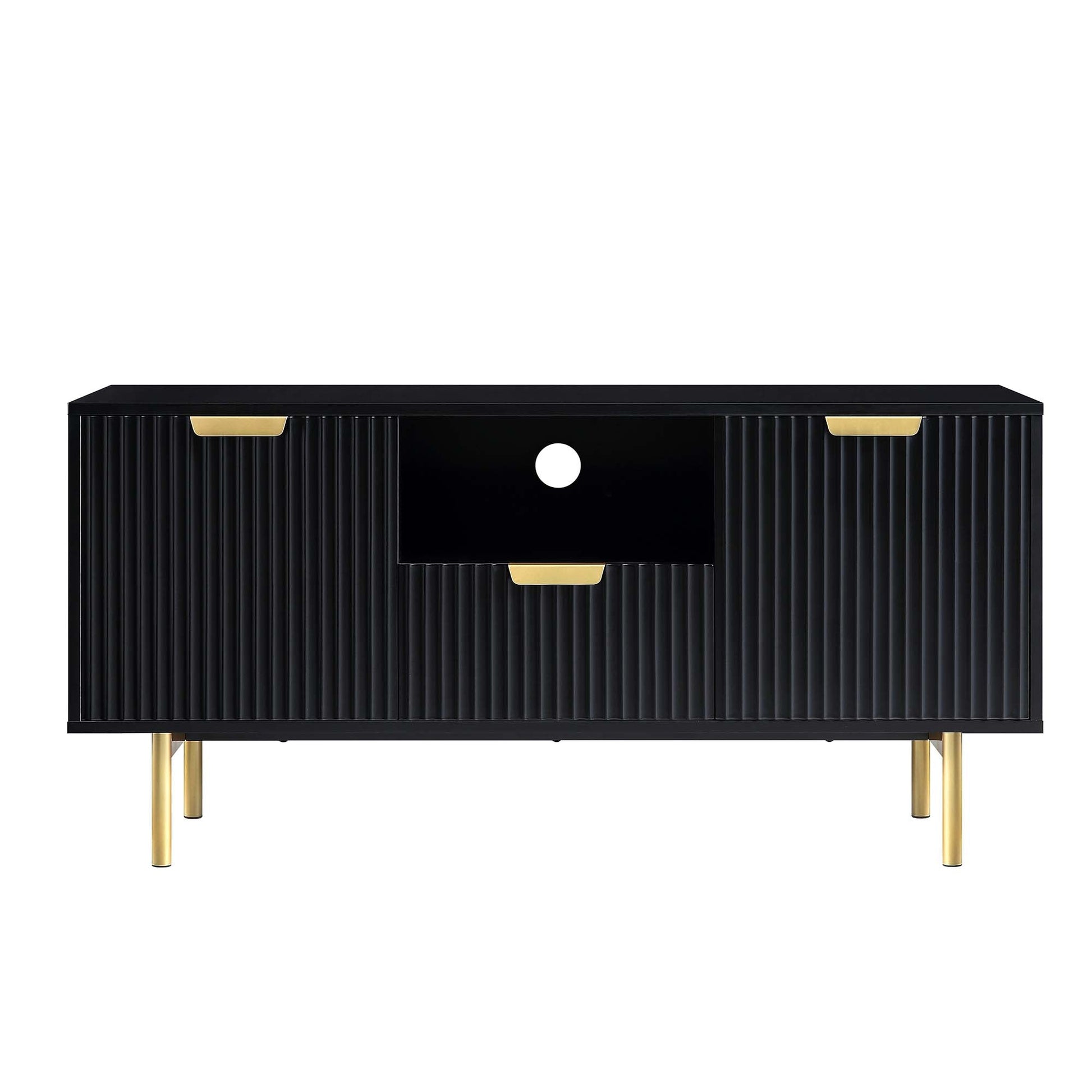 - Le meuble TV de 120 cm de large est doté d'une façade nervurée avec une finition en peinture noire mate, complétée par des poignées et des pieds contrastants à effet doré.