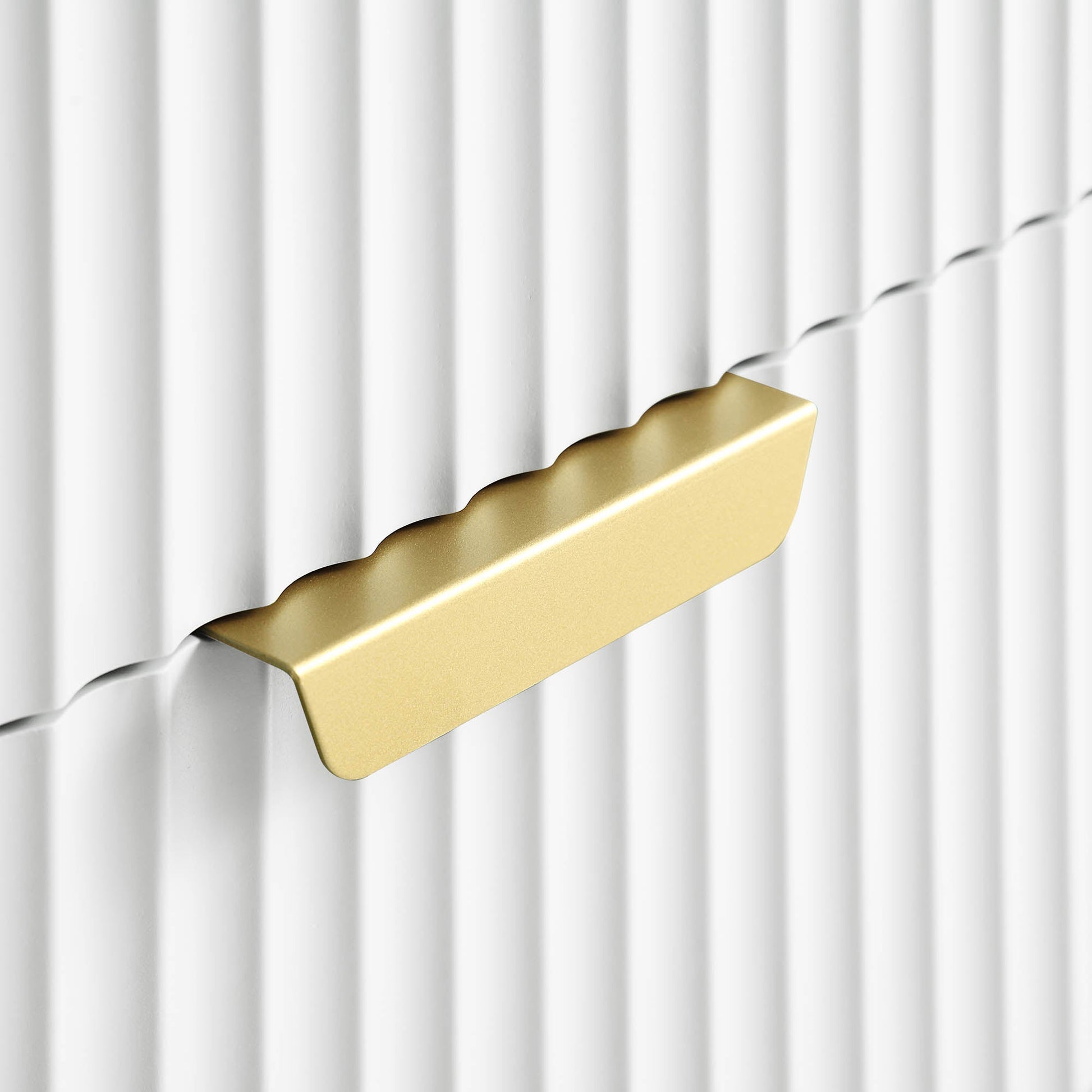 - L'armoire présente une surface striée sur les portes et les façades des tiroirs, finie en peinture blanche mate