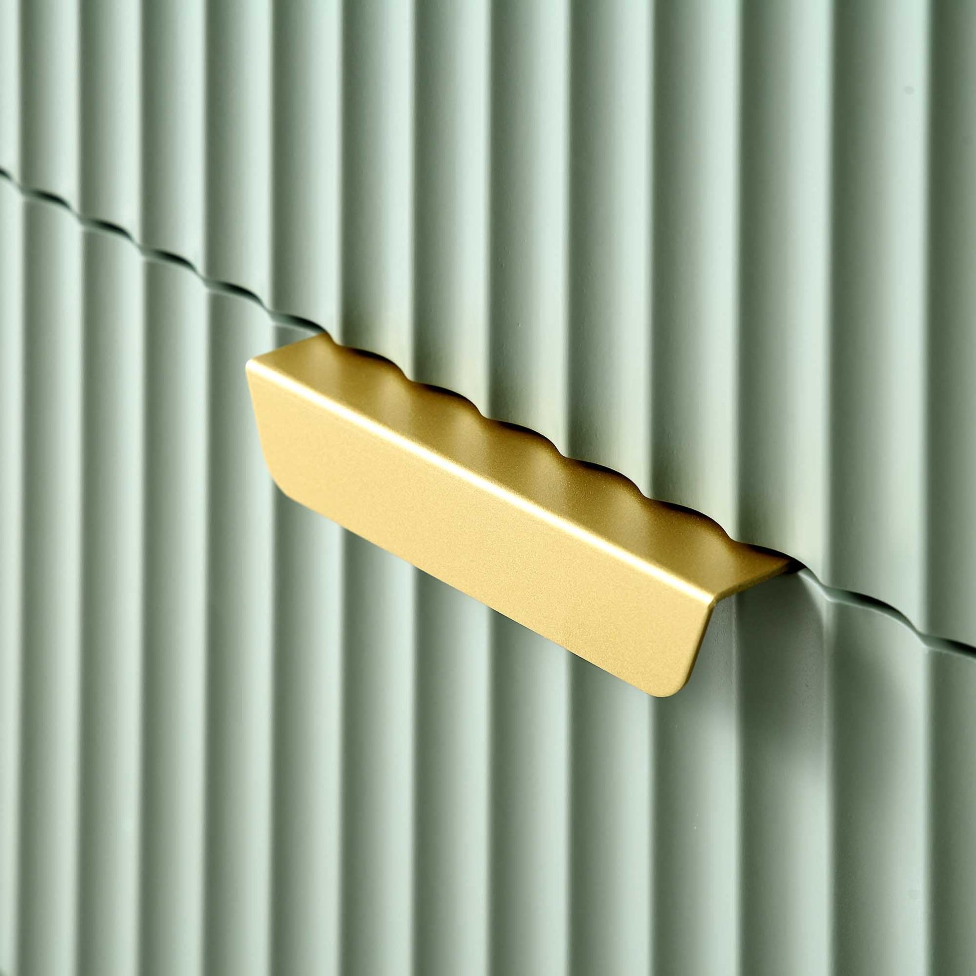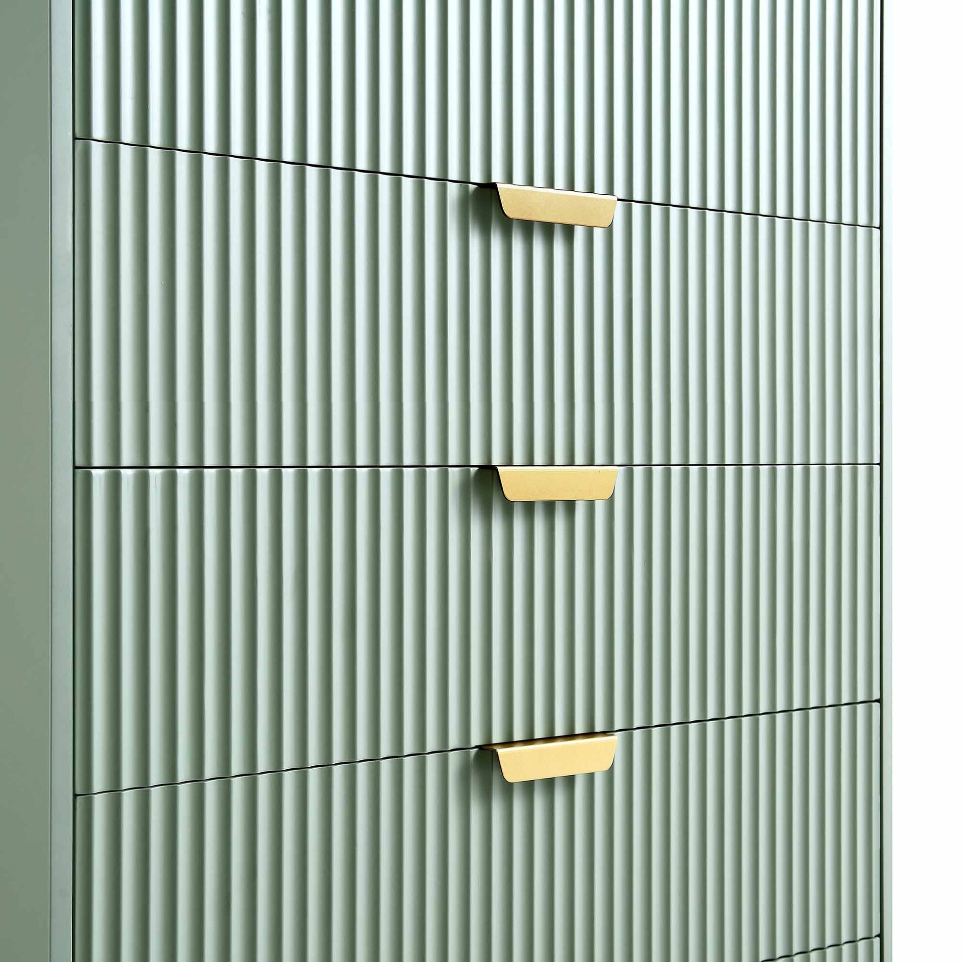 - La surface de la porte striée finie en peinture vert sauge mat, associée à des poignées et des pieds dorés, donne un look élégant et saisissant.
