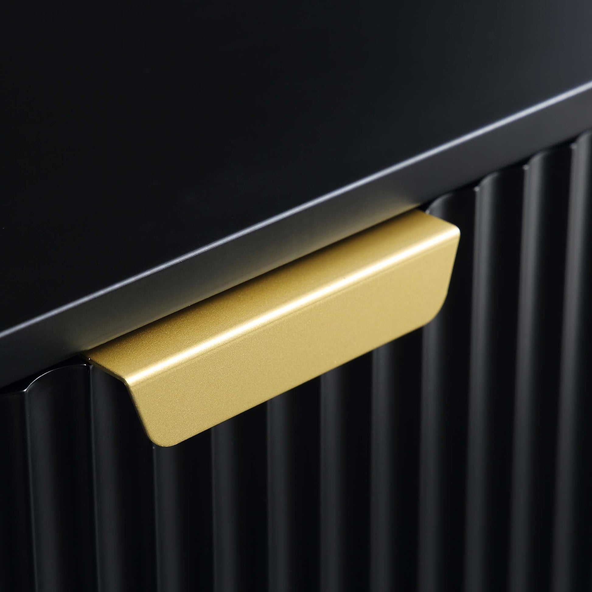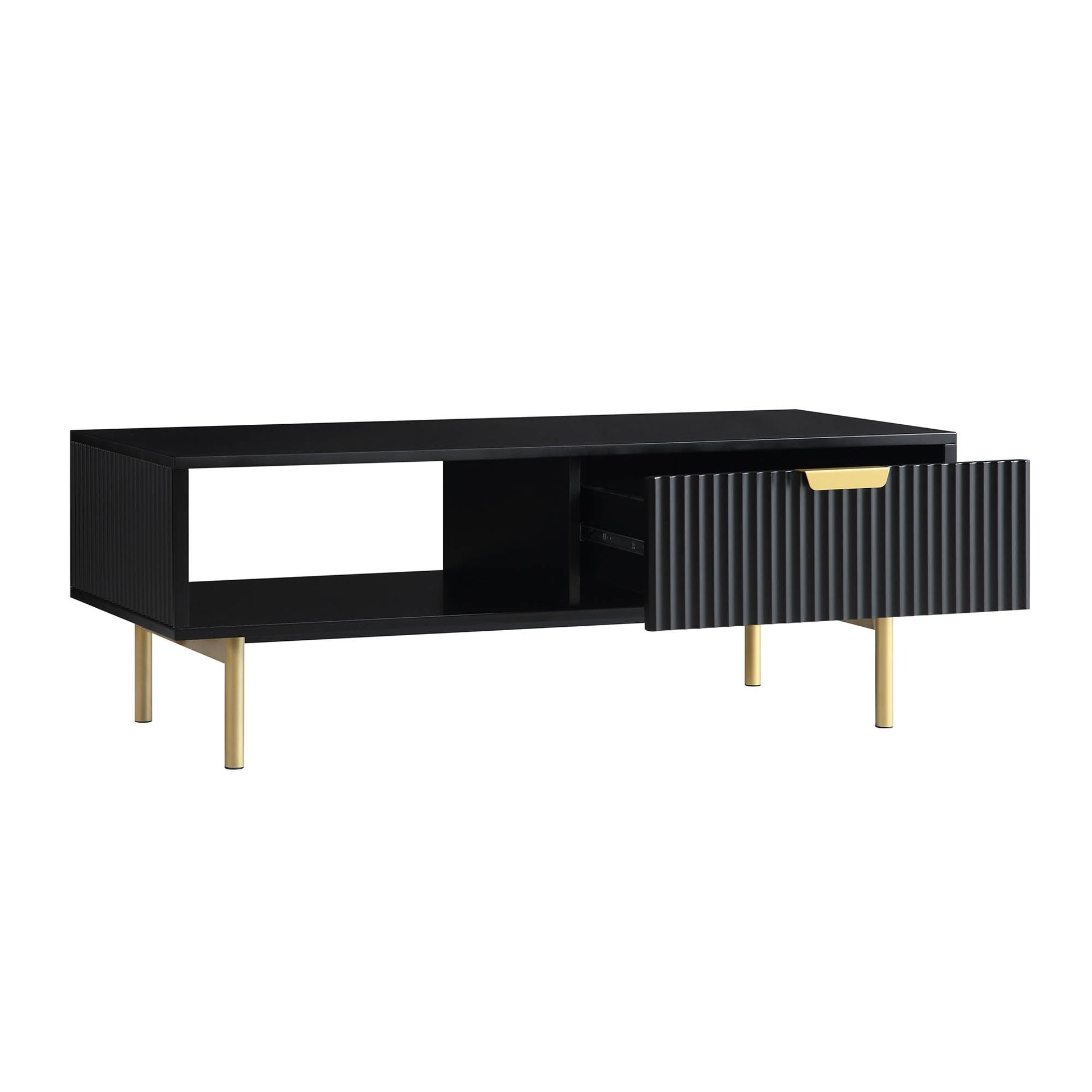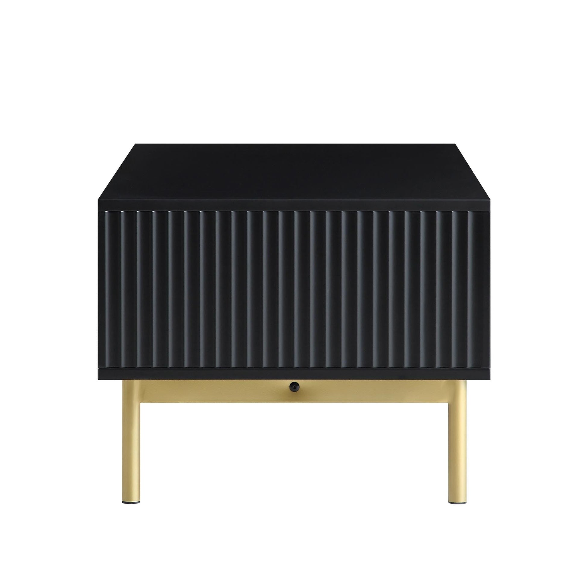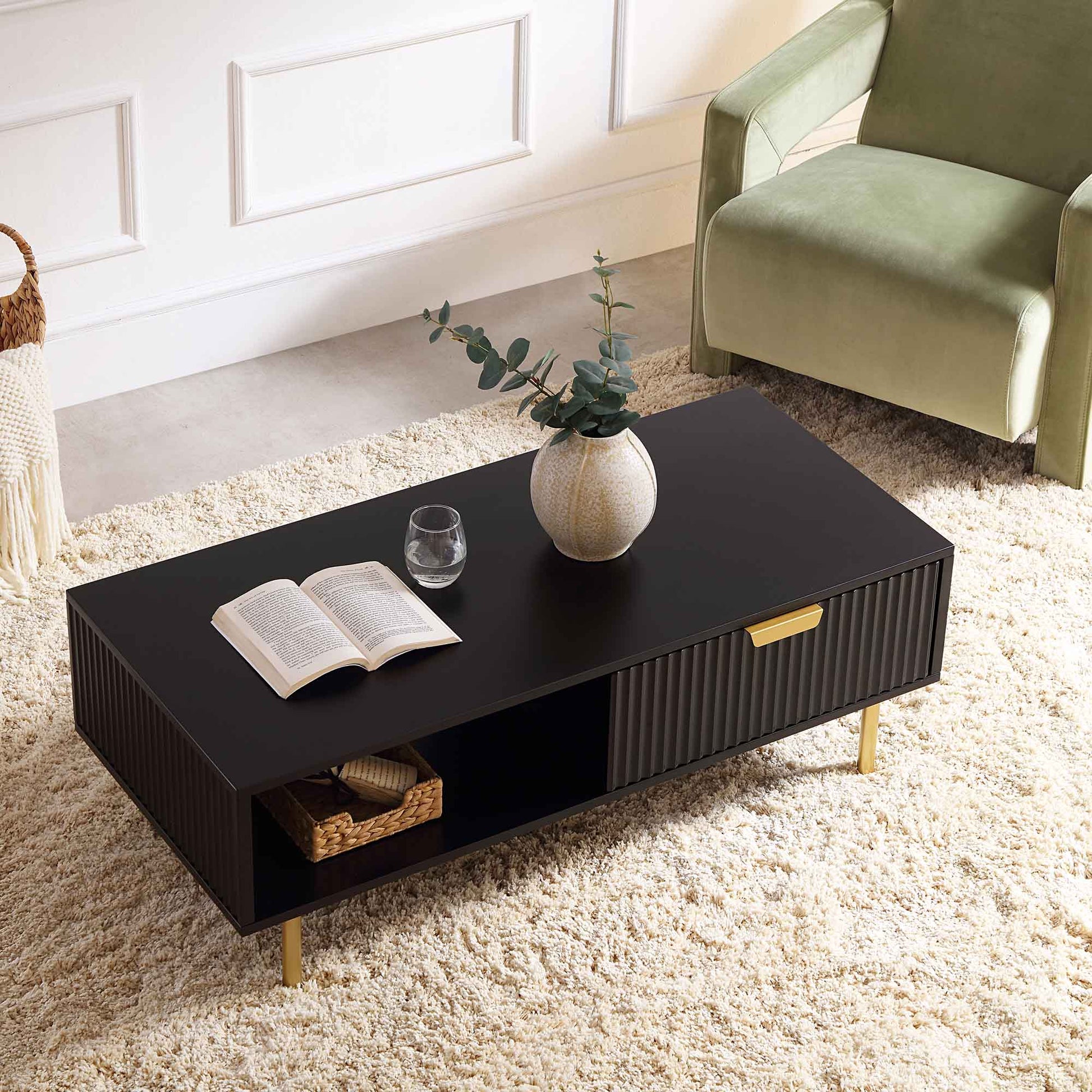 - Avec une finition striée en peinture noire mate, la table basse est encore mise en valeur par la poignée et les pieds du tiroir dorés.