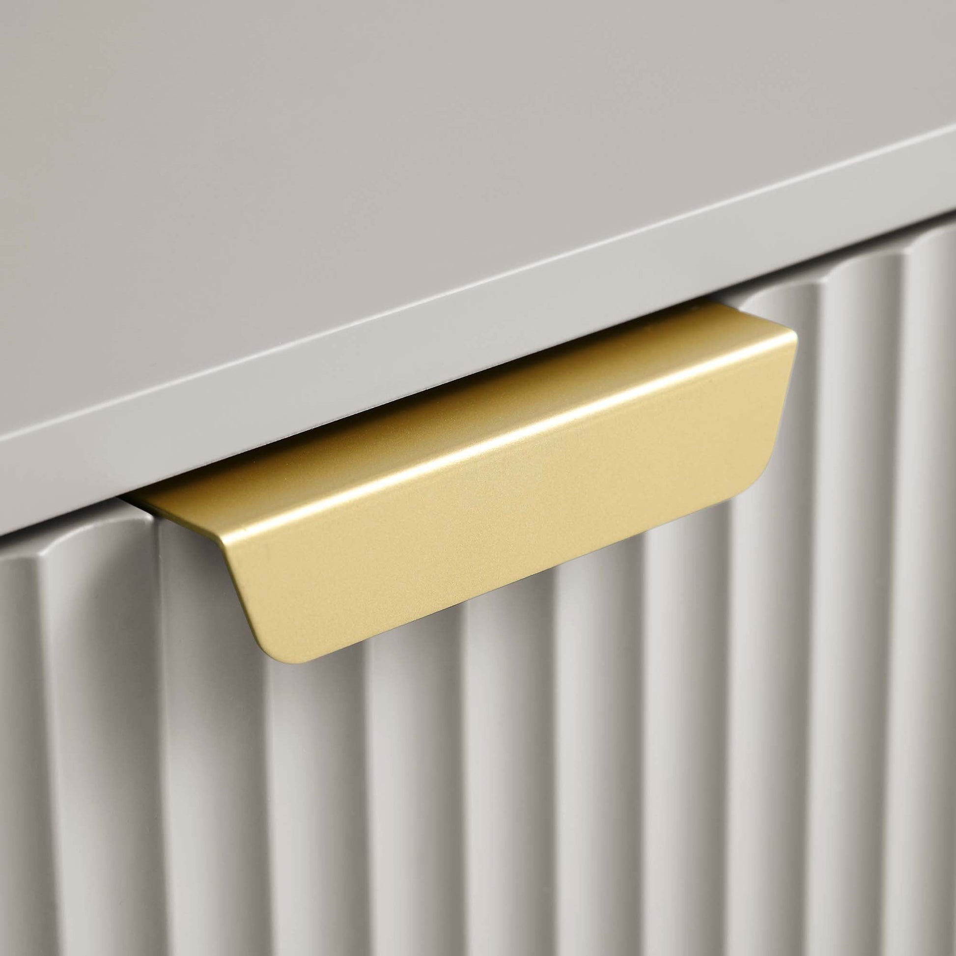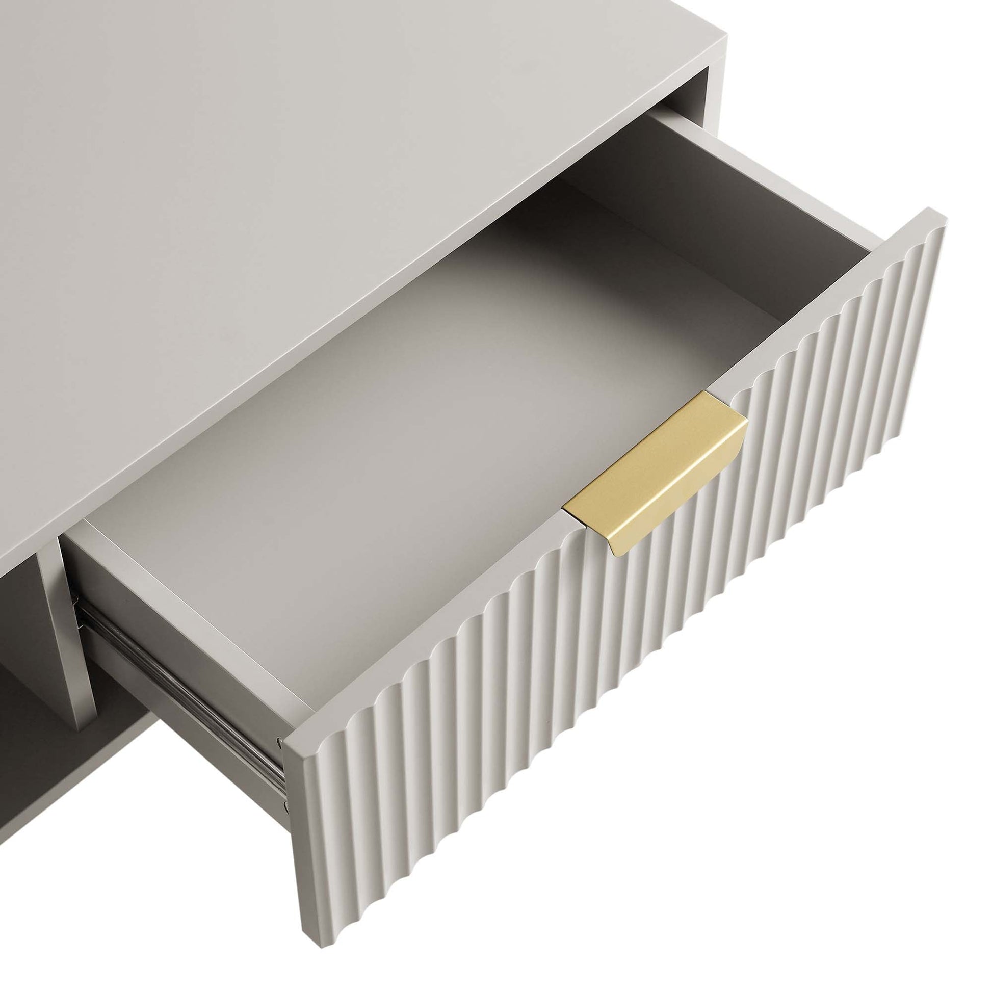 - Avec une finition striée en peinture taupe mate, la table basse est encore mise en valeur par la poignée et les pieds du tiroir dorés.