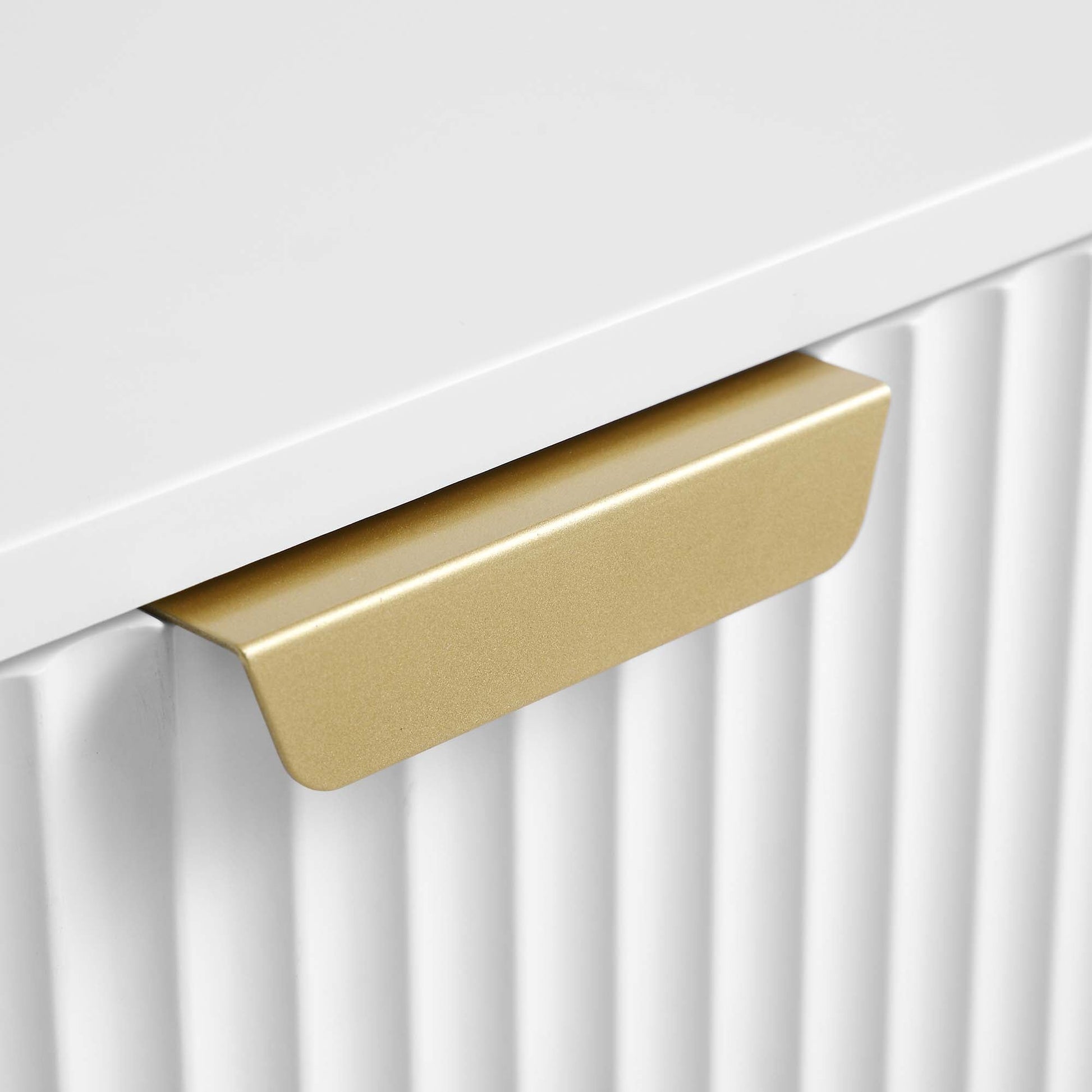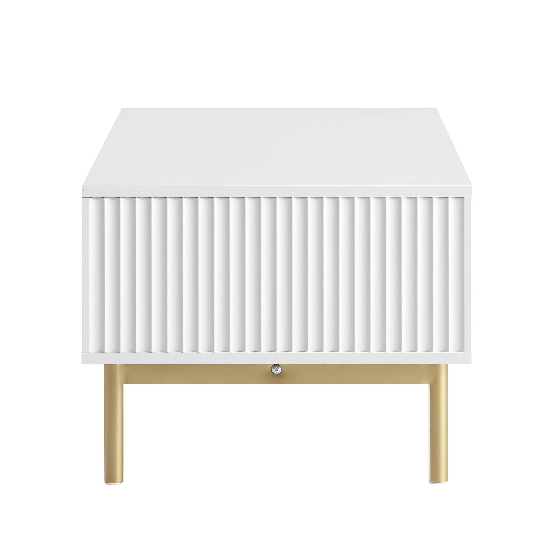 - Avec une finition striée en peinture blanche mate, la table basse est encore mise en valeur par la poignée et les pieds du tiroir dorés.