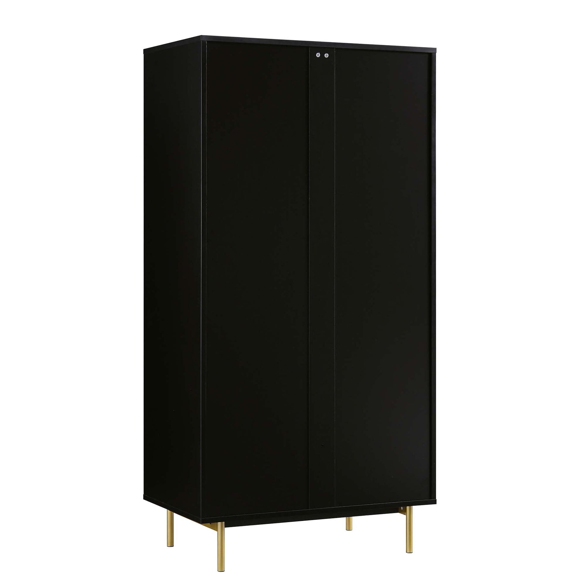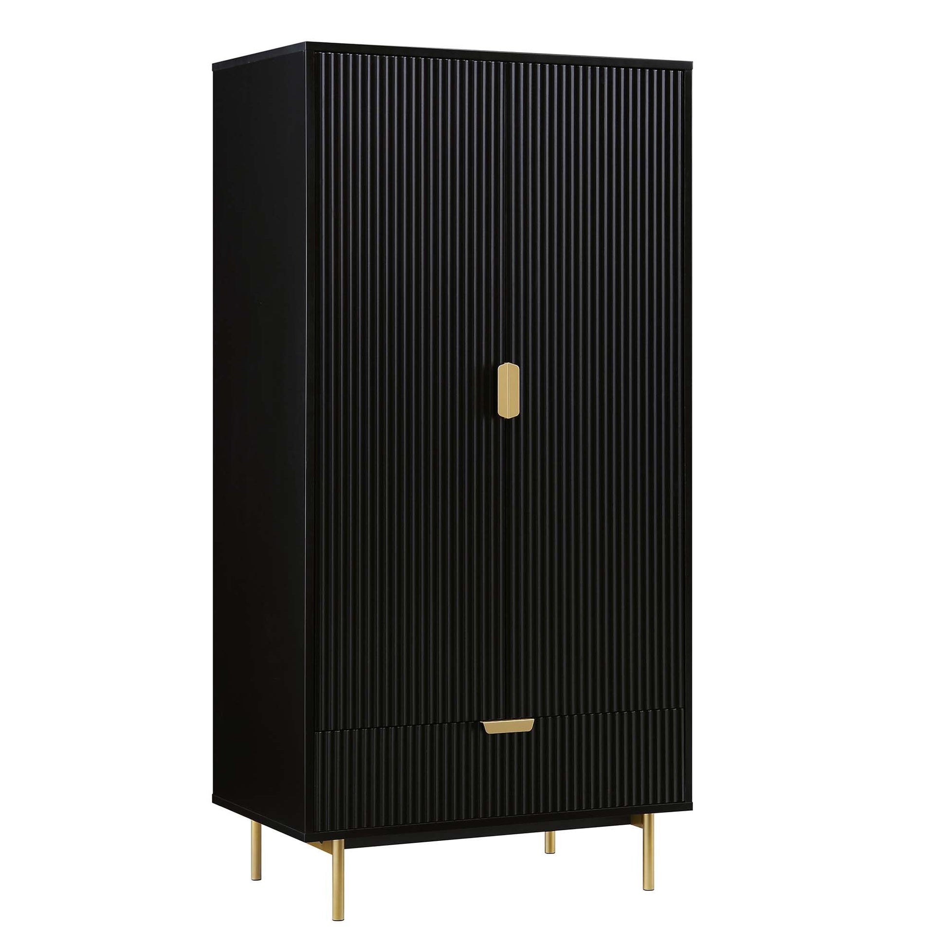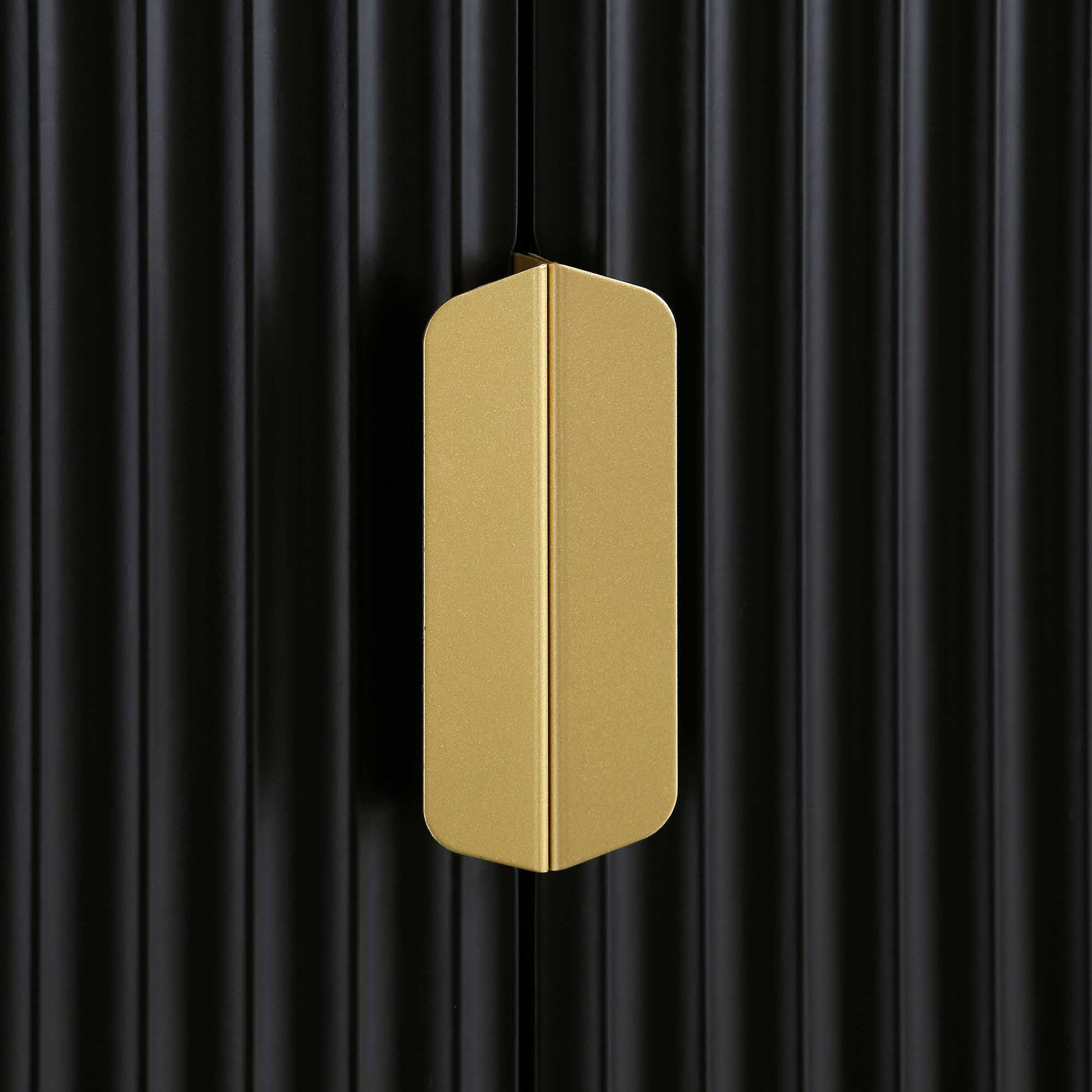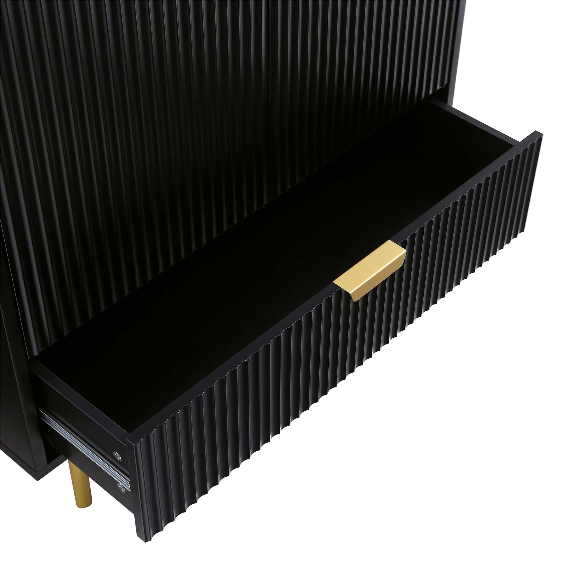 - L'armoire est dotée de portes striées élégantes et d'une façade de tiroir finie en peinture noire mate, associée à des poignées et des pieds dorés.