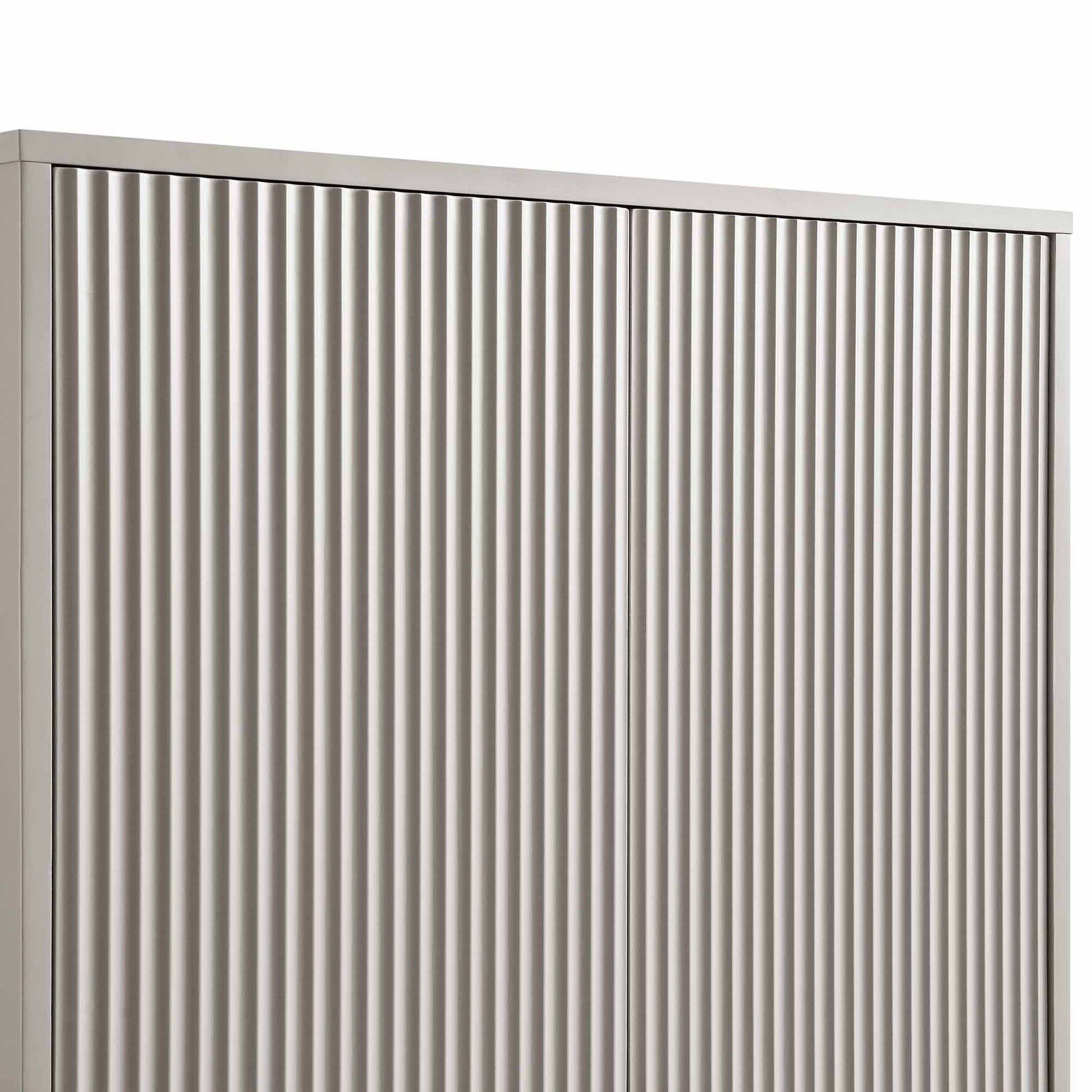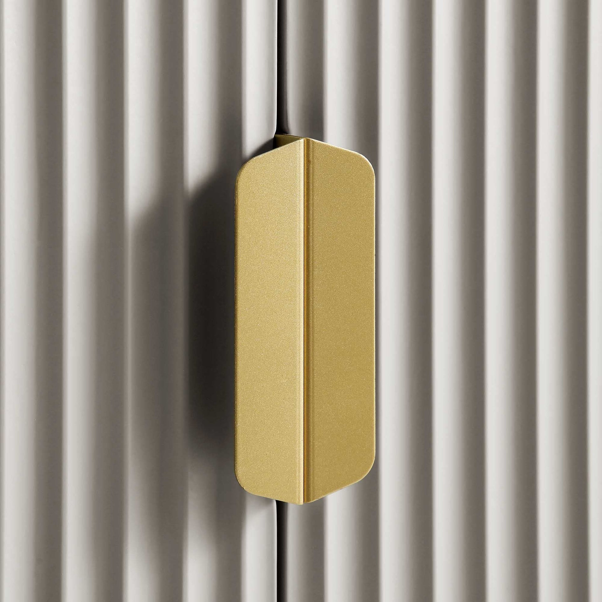 - L'armoire est dotée de portes striées élégantes et d'une façade de tiroir finie en peinture taupe mate, associée à des poignées et des pieds dorés