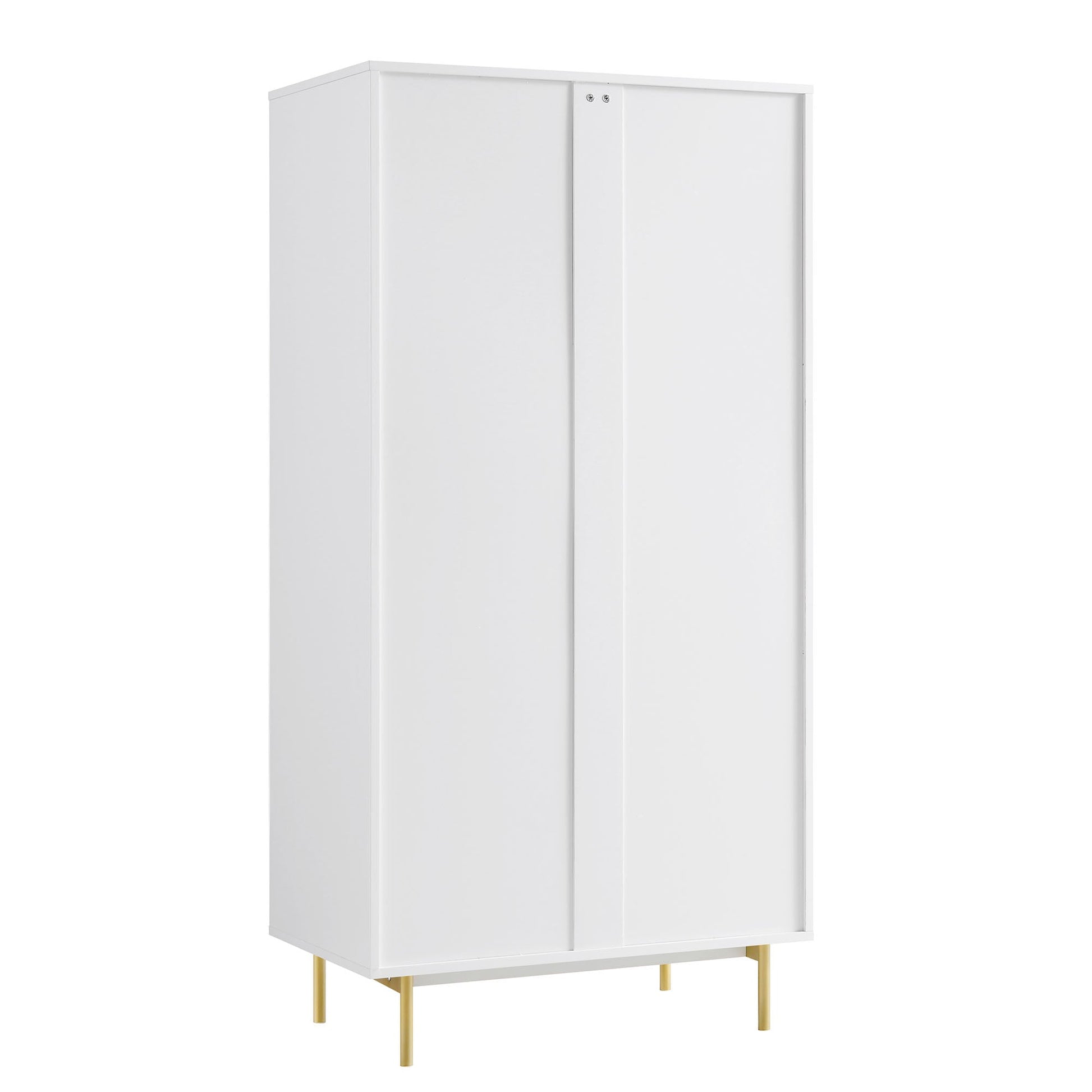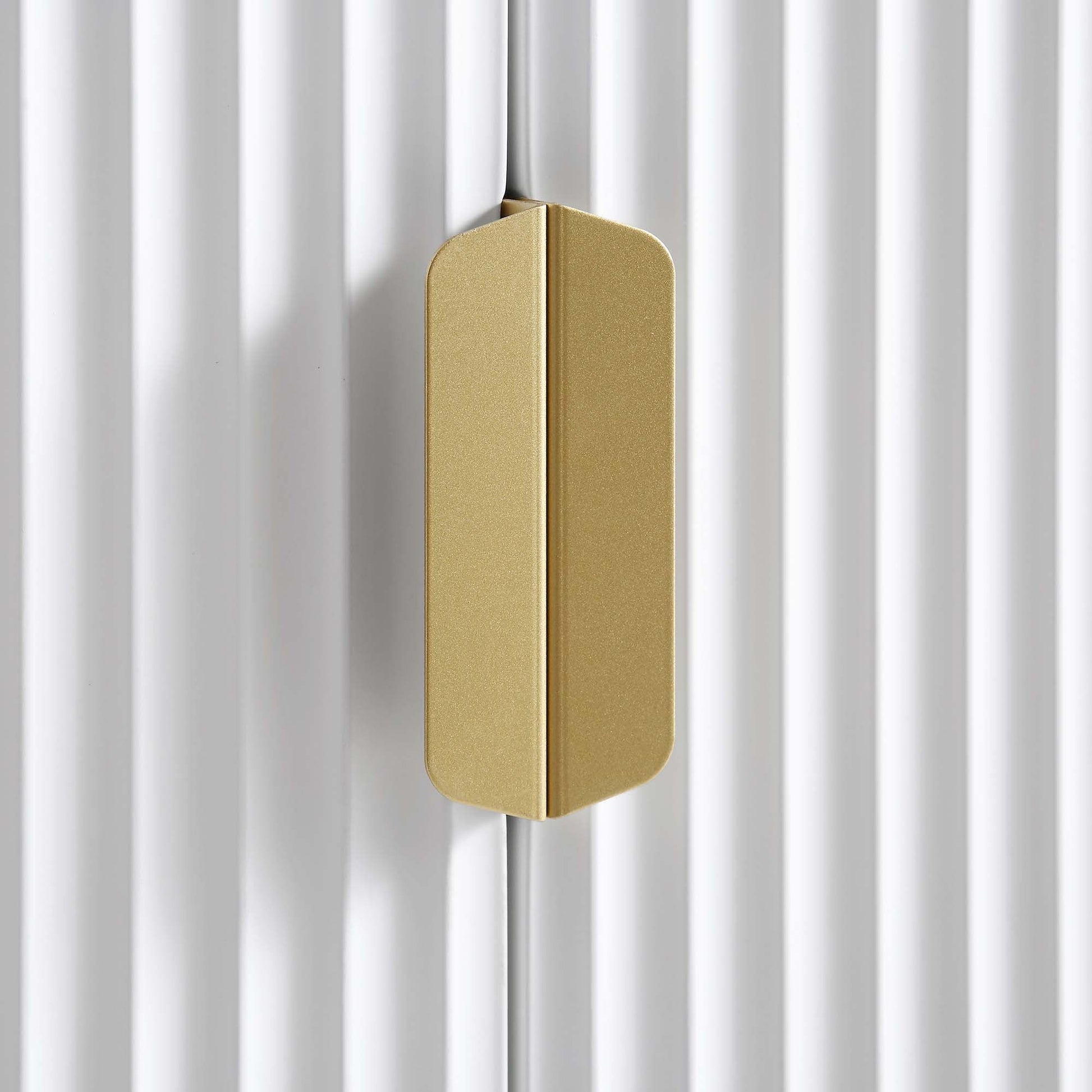 - L'armoire est dotée de portes striées élégantes et d'une façade de tiroir finie en peinture blanche mate, associée à des poignées et des pieds dorés.