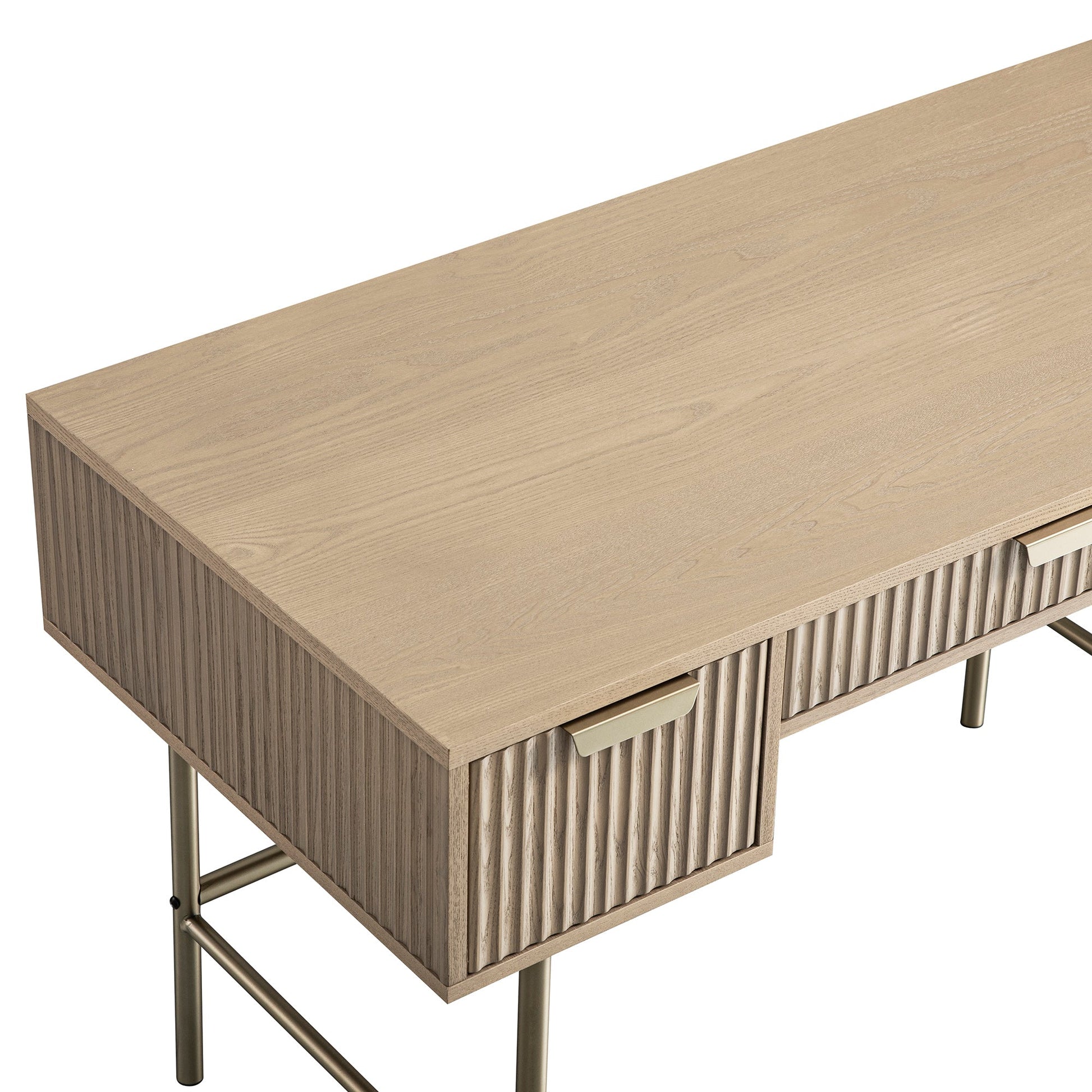 - La coiffeuse comprend 3 tiroirs avec une façade striée finie en teinture de couleur claire, associée à des poignées et des pieds dorés.