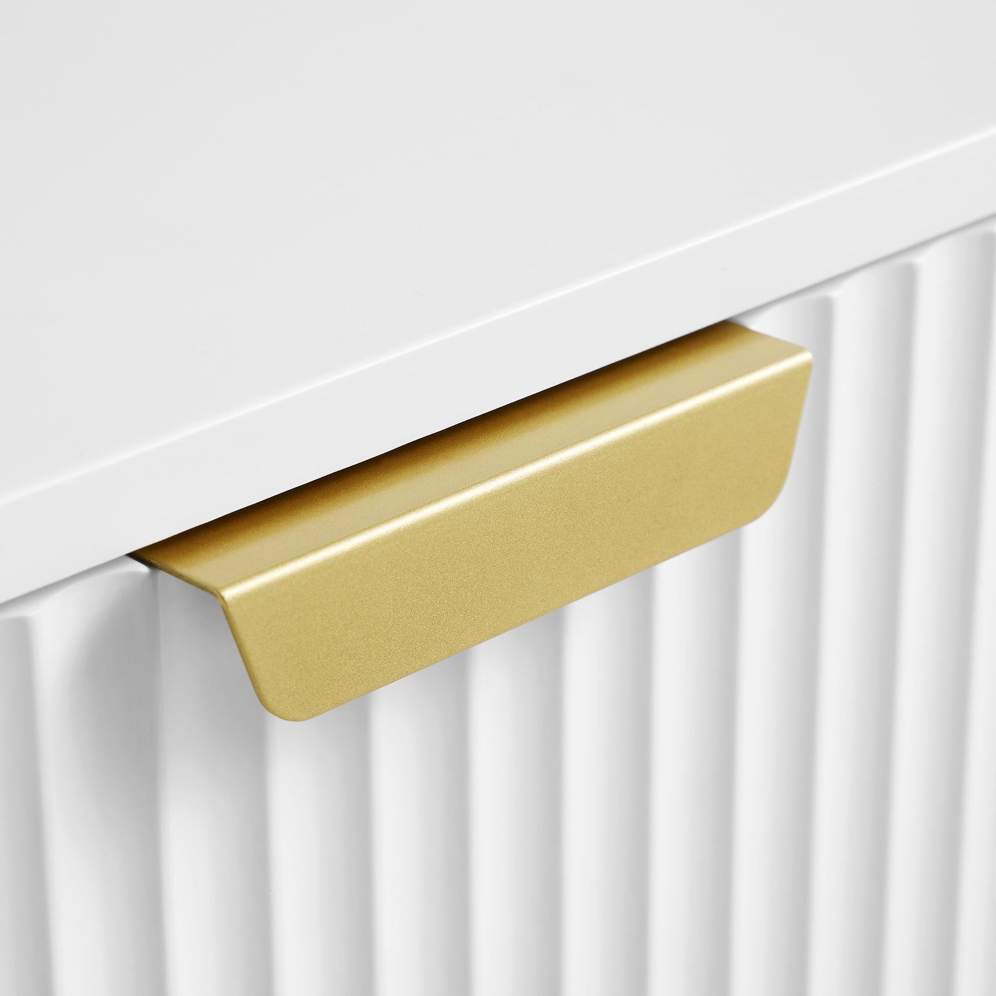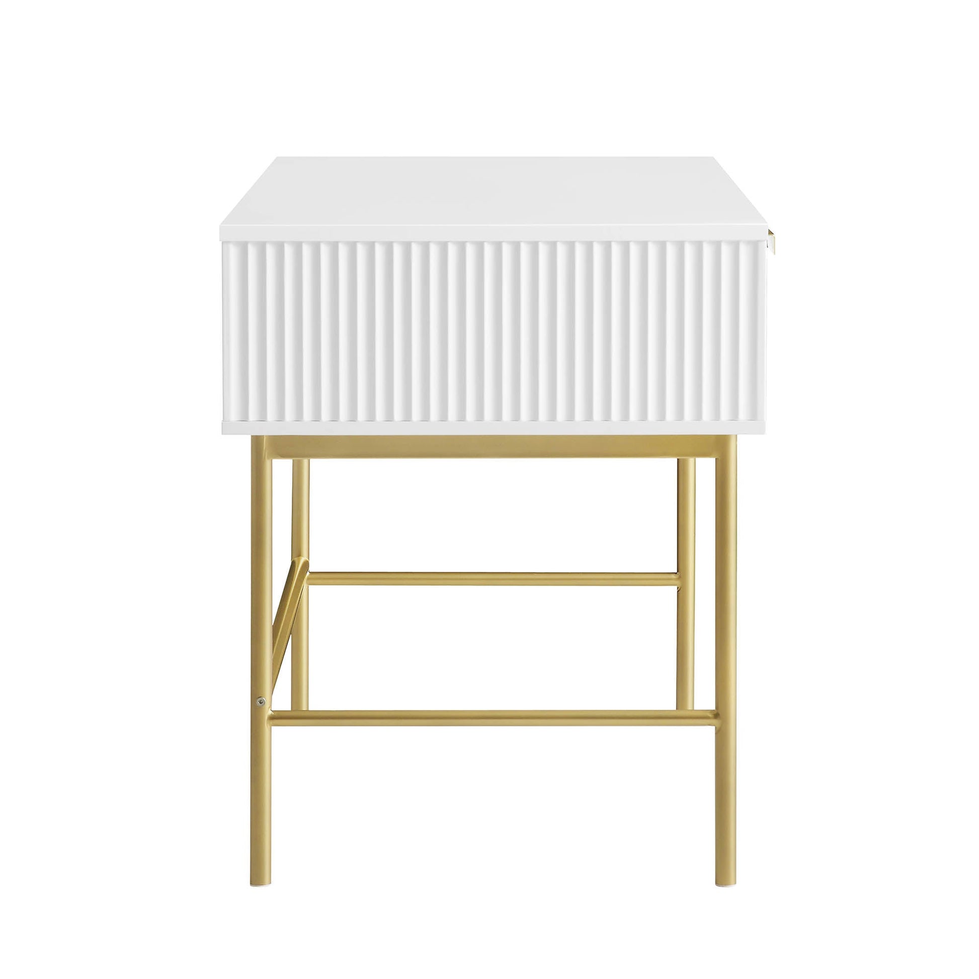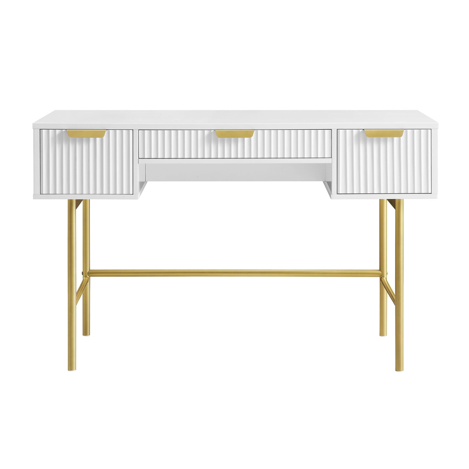 - La coiffeuse comprend 3 tiroirs avec une façade striée finie en peinture blanche mate, accentuée de poignées et de pieds dorés.