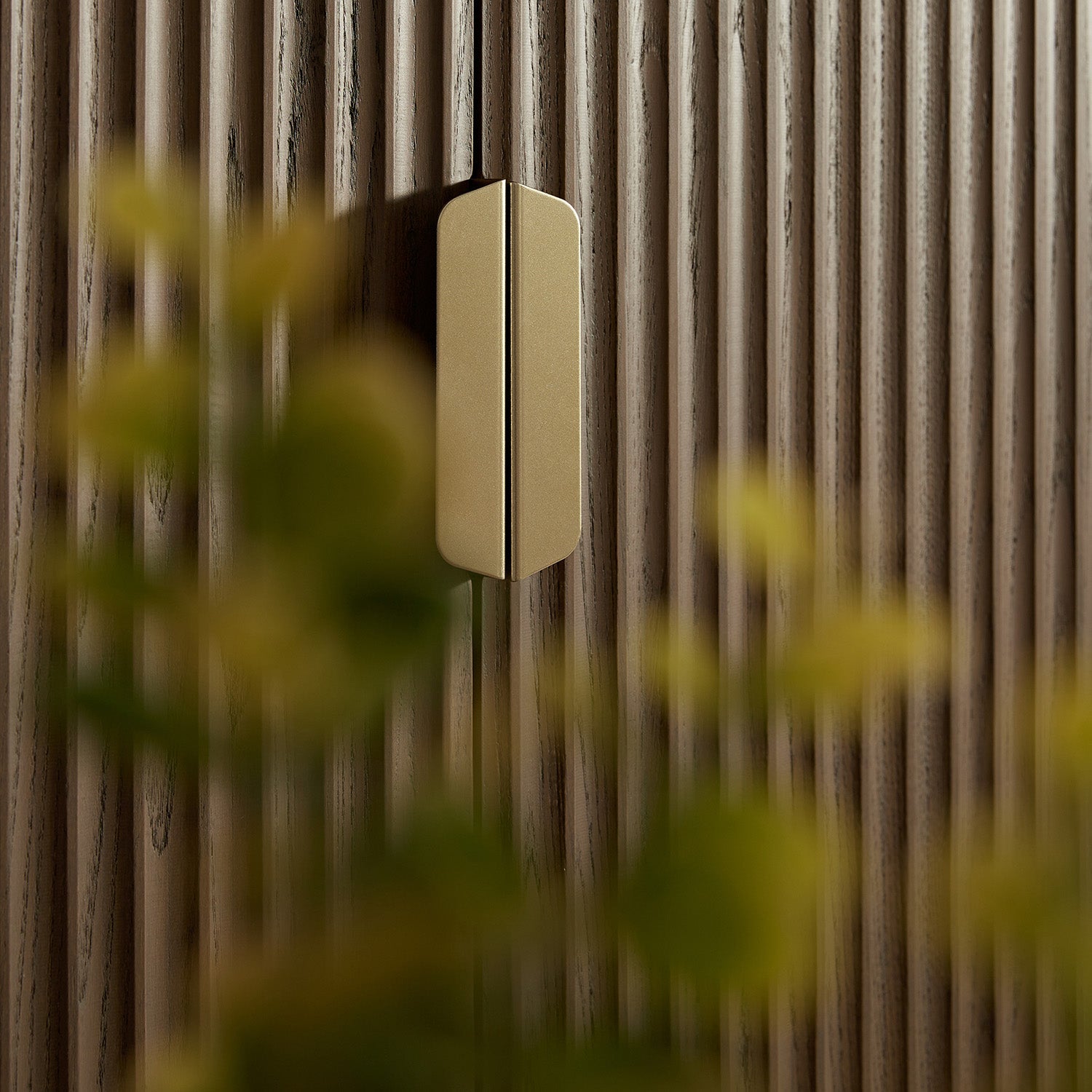- Son cadre aux lignes épurées est associé à une façade de porte striée audacieuse, tandis que les pieds minces en métal brossé ajoutent une touche subtile de glamour.