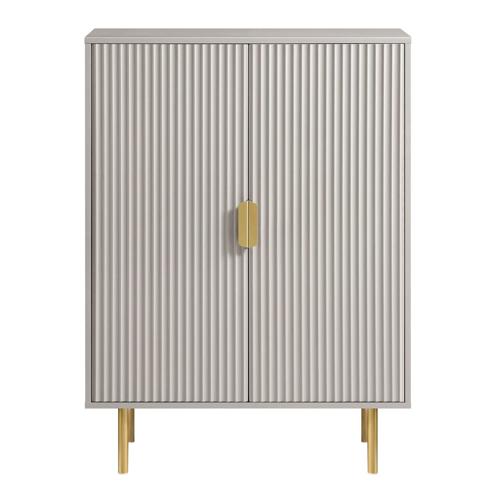 - L'armoire présente une surface de porte striée finie en peinture taupe mate, associée à des poignées et des pieds dorés.