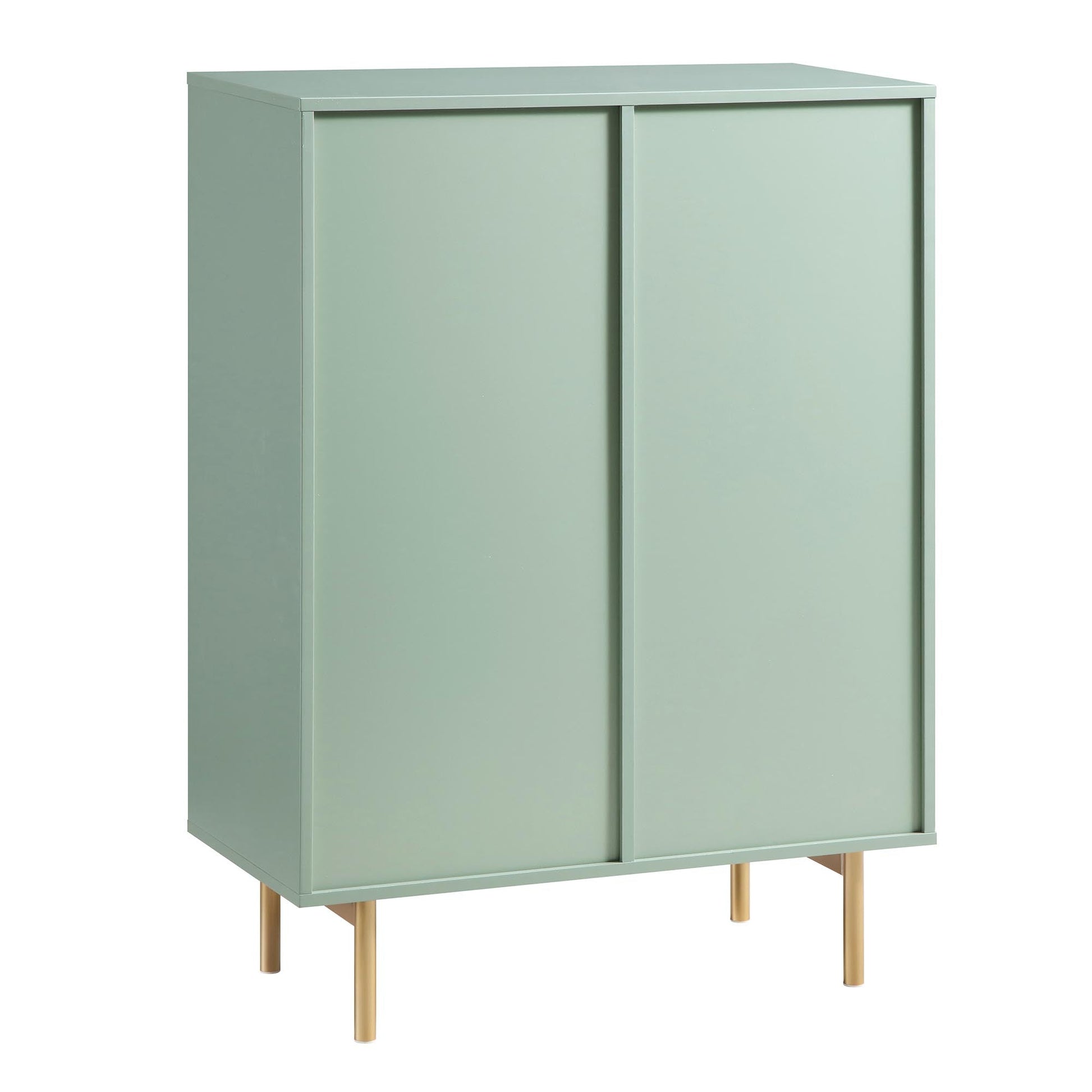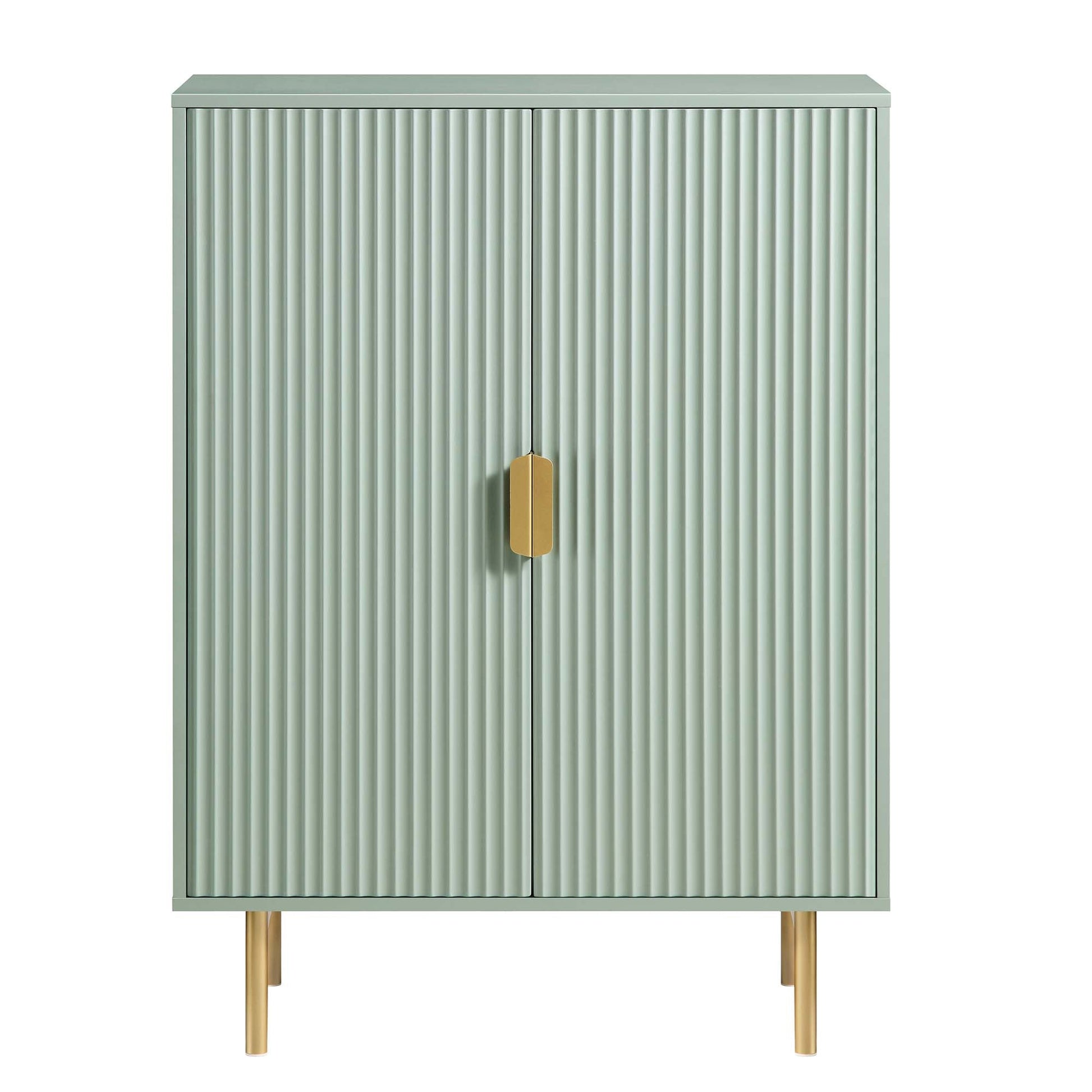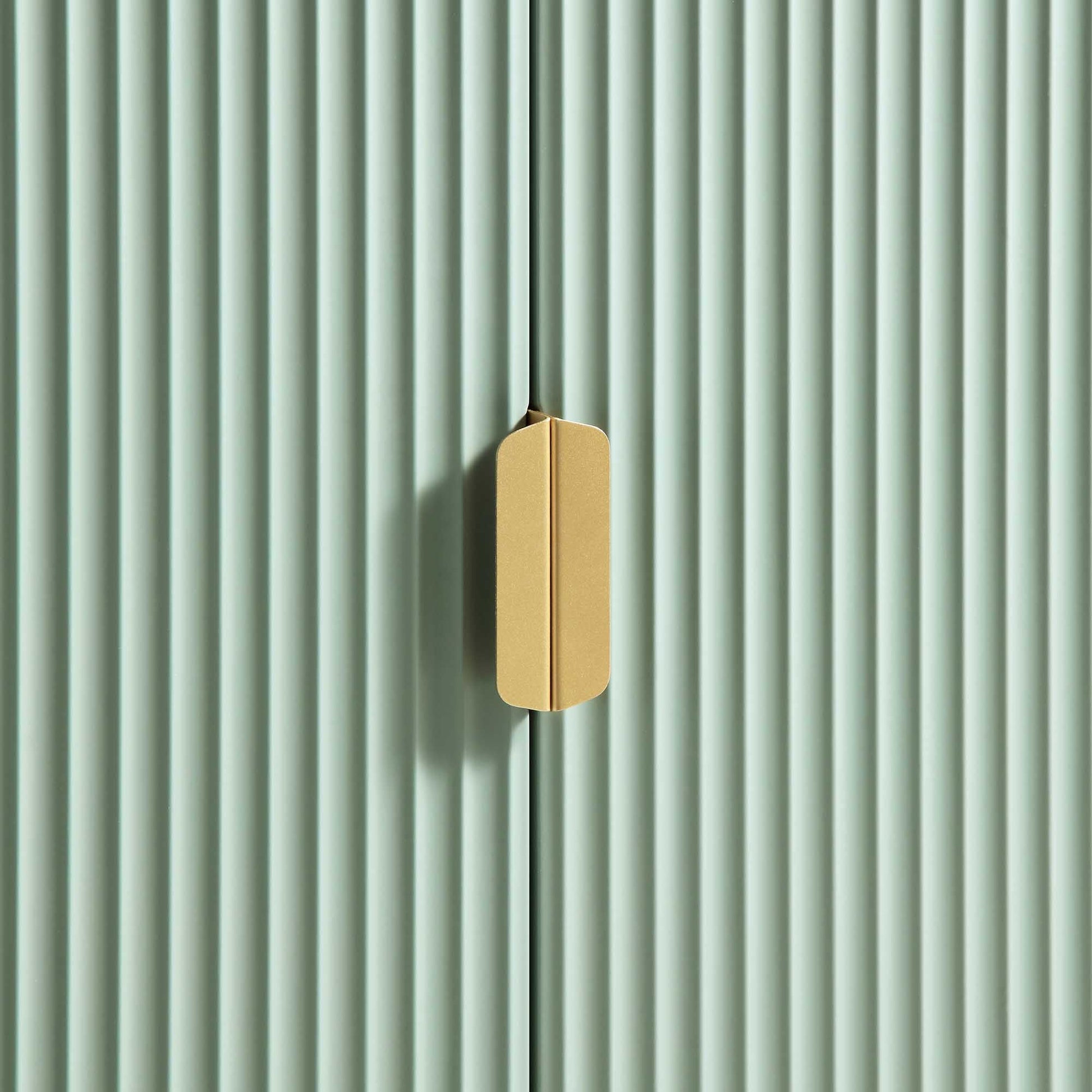 - L'armoire présente une surface de porte striée finie avec une peinture de couleur vert sauge mat, associée à des poignées et des pieds dorés.